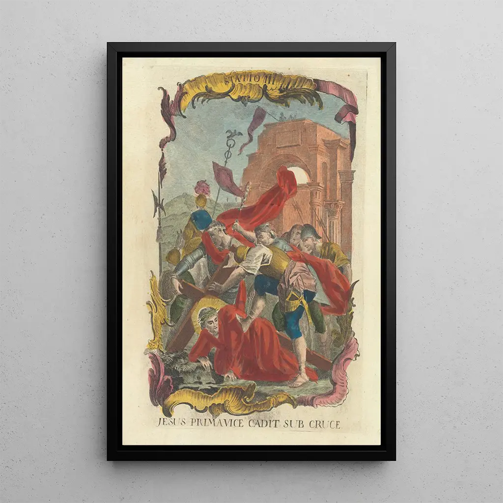Tässä koskettavassa taidegrafiikan reproduktion, Jeesus, ristin painon alla, kaatuu maahan. Tummat ja maamaiset värit luovat toivottomuuden tunnelman, kun taas valon sävyt korostavat Kristuksen kärsimystä. Dynaaminen koostumus, jossa ympäröivät hahmot ilmentävät myötätuntoa ja ahdistusta, vetää katseen teoksen keskelle. Maalaustekniikka, joka yhdistää realismia ja ekspressionismia, mahdollistaa tämän traagisen hetken intensiteetin kokemisen, jossa usko ja kärsimys kohtaavat traagisessa tanssissa.