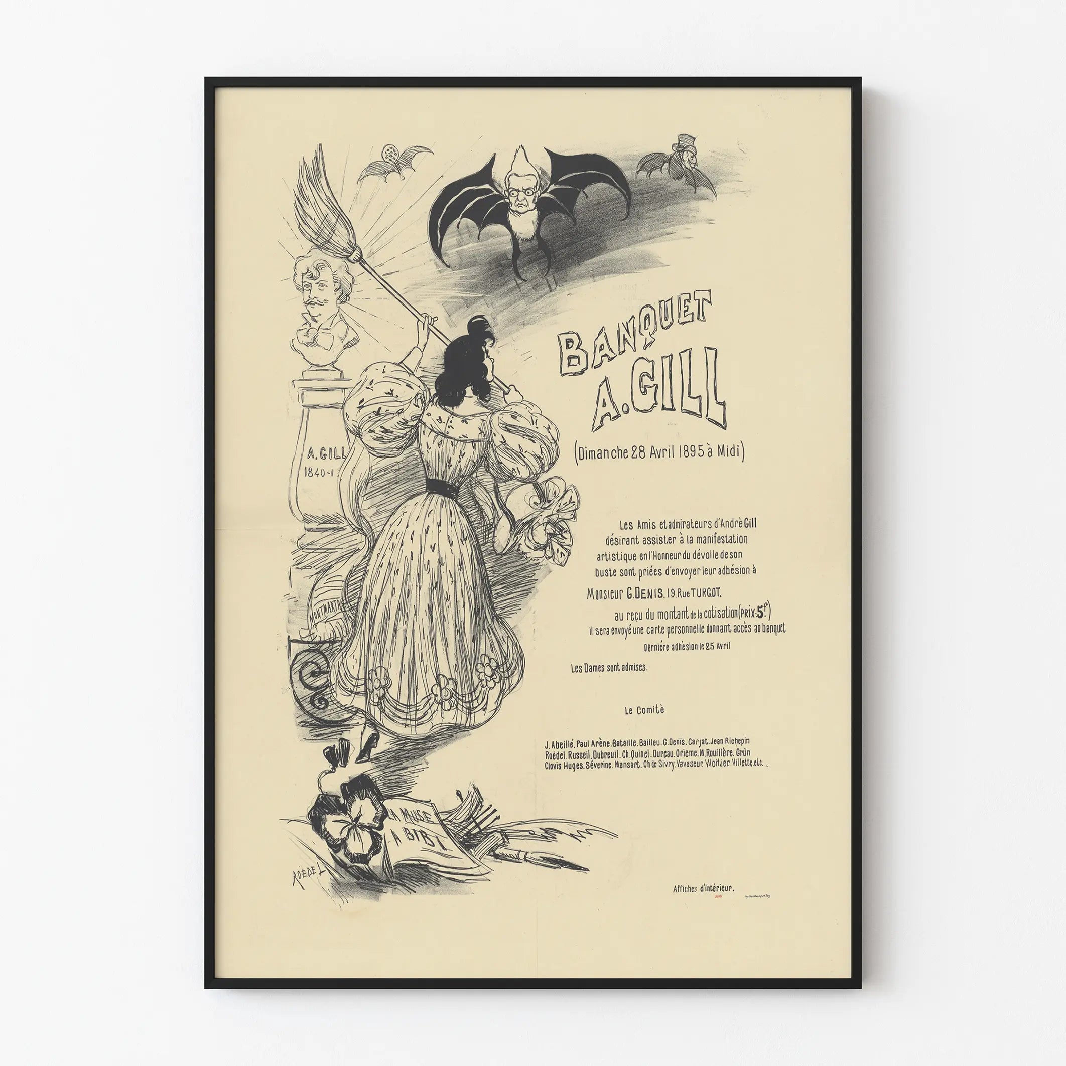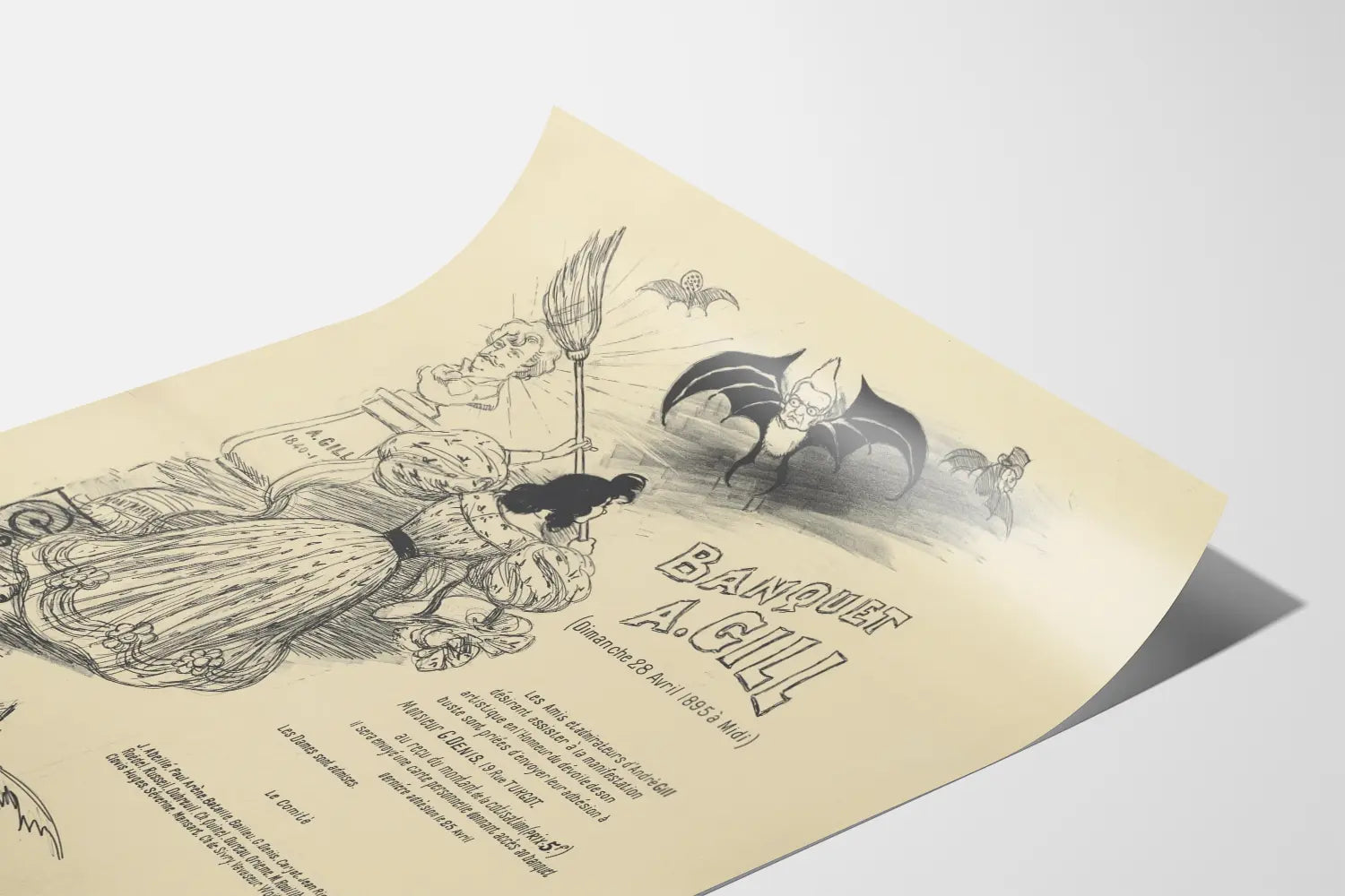 Piirrosta täydentävät ihmiskasvoiset lepakkohahmot, jotka korostavat karikatyyrimäistä tyyliä ja kiehtovaa tunnelmaa, joka oli tyypillistä tuolle ajalle. Vanhan typografian käyttö viittaa kutsuun juhlaillalliselle, joka on järjestetty André Gillin kunniaksi, merkittävän hahmon, joka on esitetty rintakuvana, sekä viralliseen tekstiin, joka kutsuu ystävät ja ihailijat osallistumaan tähän taiteelliseen tapahtumaan.
