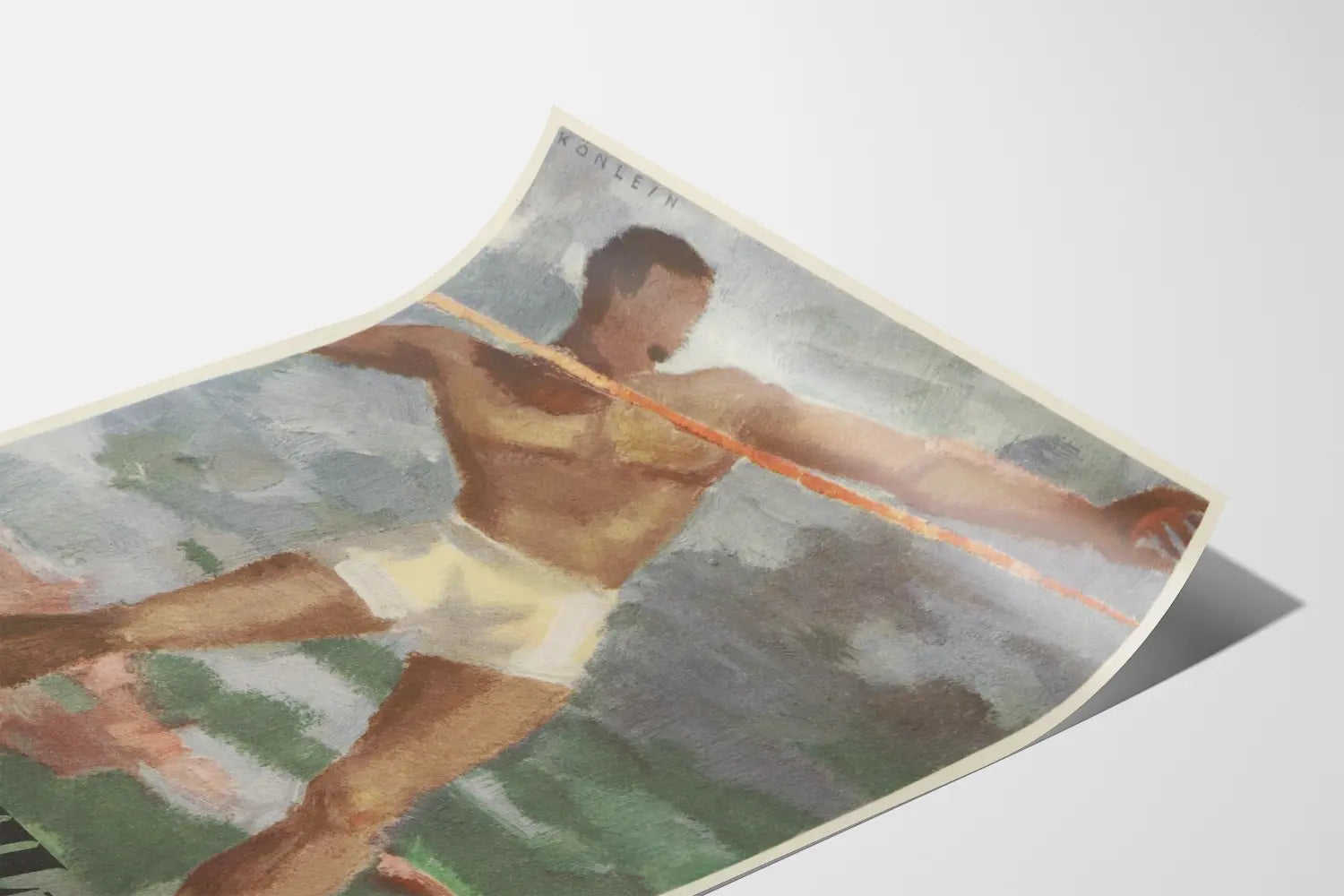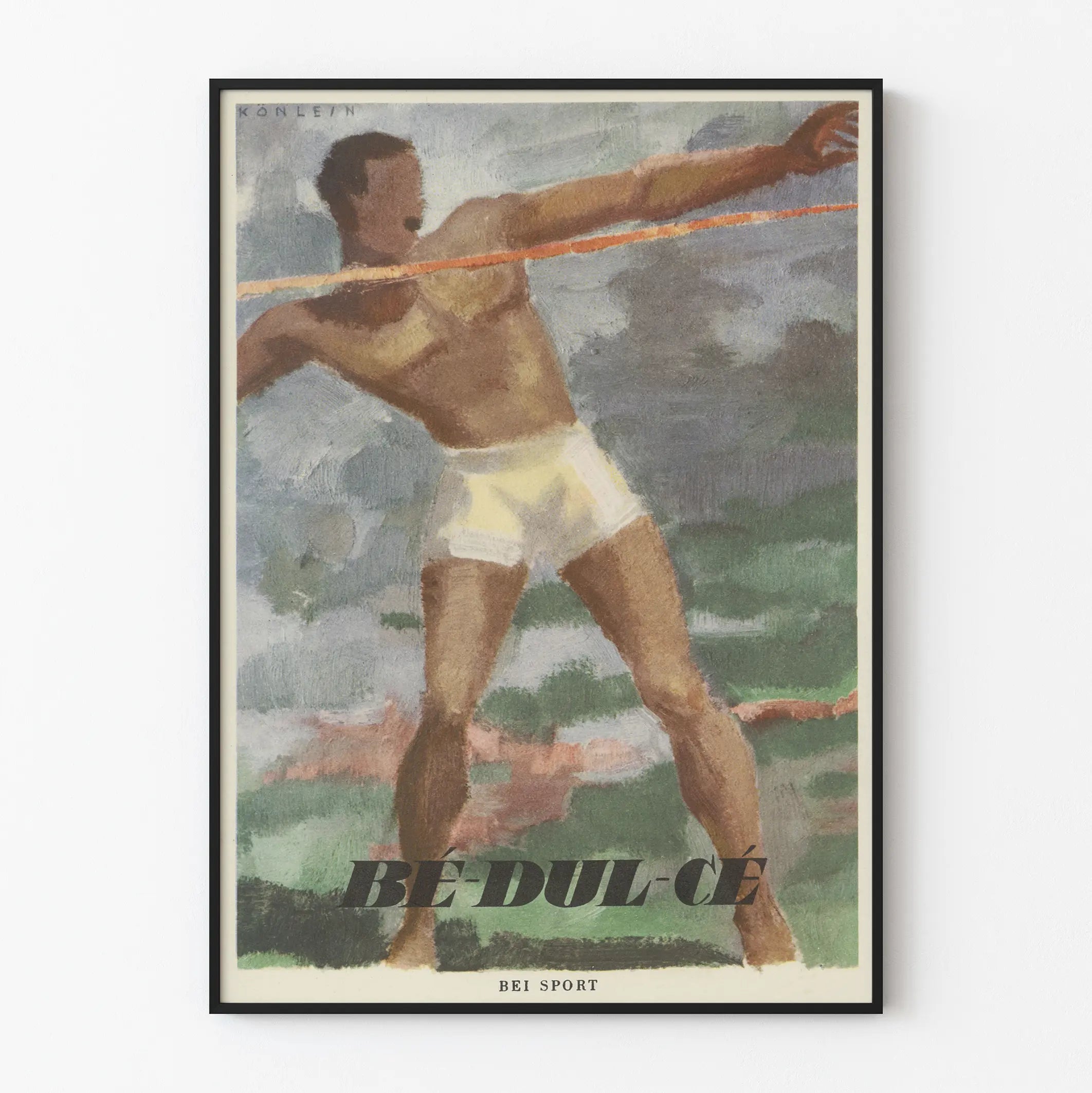 Tämä Bé-Dul-Cé juliste esittää urheilijaa täydessä toiminnassa keihäänheitossa, symboloiden urheilun voimaa ja ketteryyttä. Hahmo käyttää valkoista shortsia ja esittää dynaamisen asennon, joka vangitsee liikkeen ja energian urheiluliikkeessä. Teos leikkii pehmeillä ja luonnollisilla sävyillä, pääasiassa ruskean, vihreän ja harmaan sävyissä, mikä antaa sille ainutlaatuisen vintage- ja taiteellisen ilmeen.