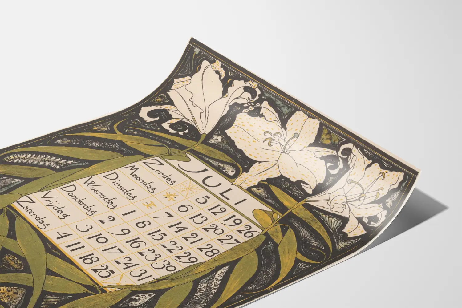 Tämä heinäkuun 1896 kalenterilista on Art Nouveau -tyylinen seinäkoriste, jonka piirteitä ovat orgaaniset linjat ja luonnolliset kuviot. Se esittää kuukausikalenterin, jonka kehystää tyylikäs piirros suurista valkoisista kukista, jotka muistuttavat liljoja, ja jotka herättävät runouden ja luonnon tunnelman. Vihreät lehdet ympäröivät keskellä olevan kalenterin harmonisessa sommittelussa, korostaen kukkamaisten elementtien merkitystä graafisessa suunnittelussa.