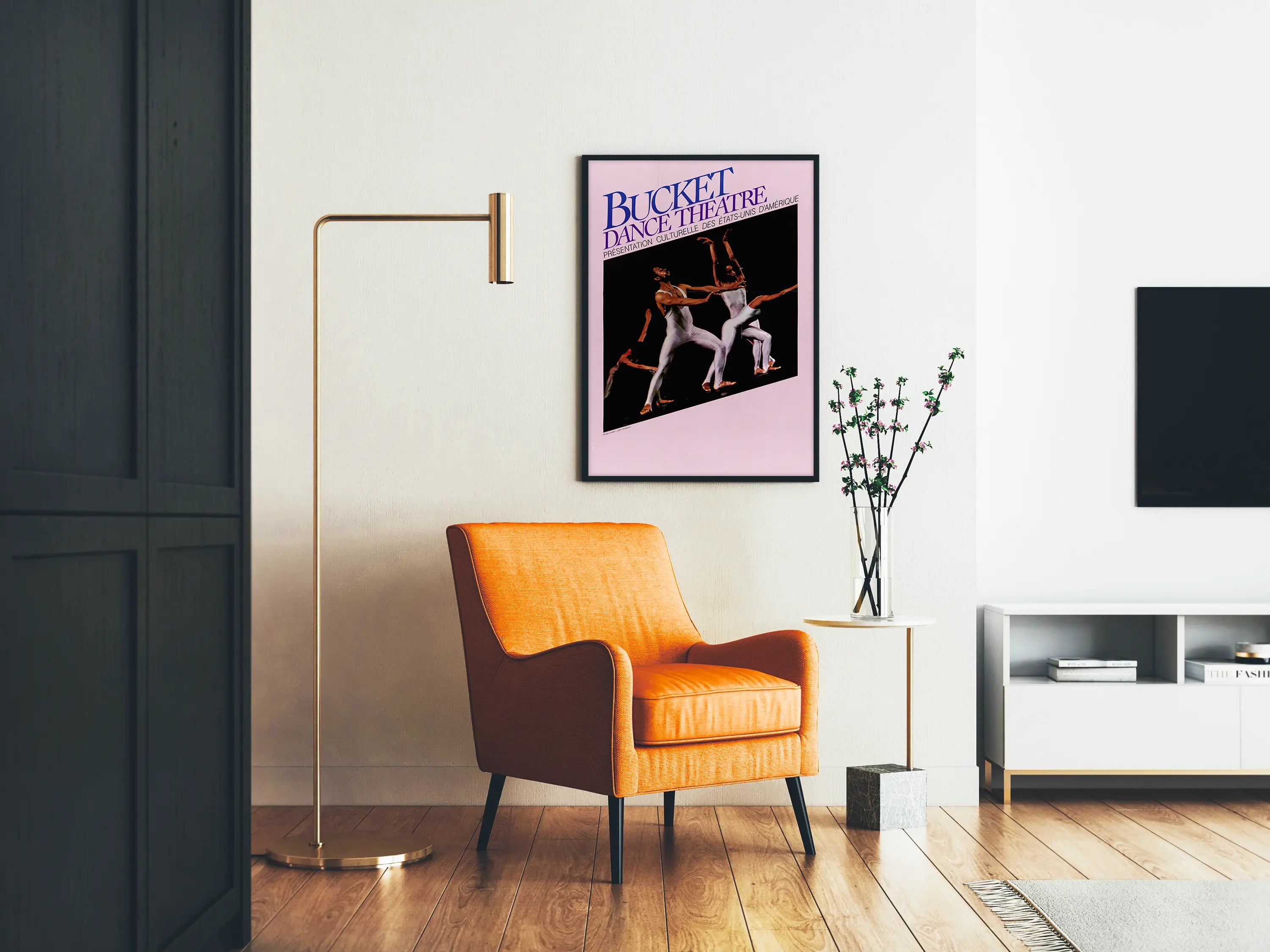 Tutustu tähän alkuperäiseen Bucket Dance Theatre -julisteeseen, joka on keskeinen osa jokaista tanssi- ja teatteriseinää koristavaa sisustusta. Tämä juliste esittelee Yhdysvaltojen kulttuurisen esityksen, kuvaten tyylikkäästi ja dynaamisesti tanssijoita täynnä taiteellista ilmaisua. Pastellipinkki taustalla keskikuva kiinnittää huomion: kolme valkoisiin trikootoppiin pukeutunutta tanssijaa, nykyaikaisen tanssin asennossa, kuvaavat liikkuvuuden sulavuutta ja voimaa. Tämä juliste on ihanteellinen tuomaan taiteellista ja kulttuurista vivahdetta tilaan, olipa kyseessä olohuone, tanssistudio, toimisto tai teatterisali. Sen huolellisesti suunniteltu graafinen koostumus yhdistää suurehkot siniset ja violetit kirjaimet otsikkoon « BUCKET DANCE THEATRE » sekä hillitymmän mustan tekstin amerikkalaisesta kulttuurista. Juliste hyödyntää myös perspektiiviefektiä diagonaalisen kuvan avulla, tehden kohtauksesta elävämmän ja immersiivisemmän. Tämä seinäkoriste yhdistää estetiikan ja tanssin intohimon, täydellinen taiteellisen esityksen harrastajille ja amerikkalaisen kulttuurin ystäville. Sisällyttämällä tämän julisteen sisätiloihisi arvostat elävää taidetta ja vahvaa kulttuurista symbolia, joka inspiroi liikettä, luovuutta ja kehon ilmaisua. Alkuperäinen ja tyylikäs sisustusvalinta, joka korostaa seiniäsi ja välittää elävän esityksen tunteen.