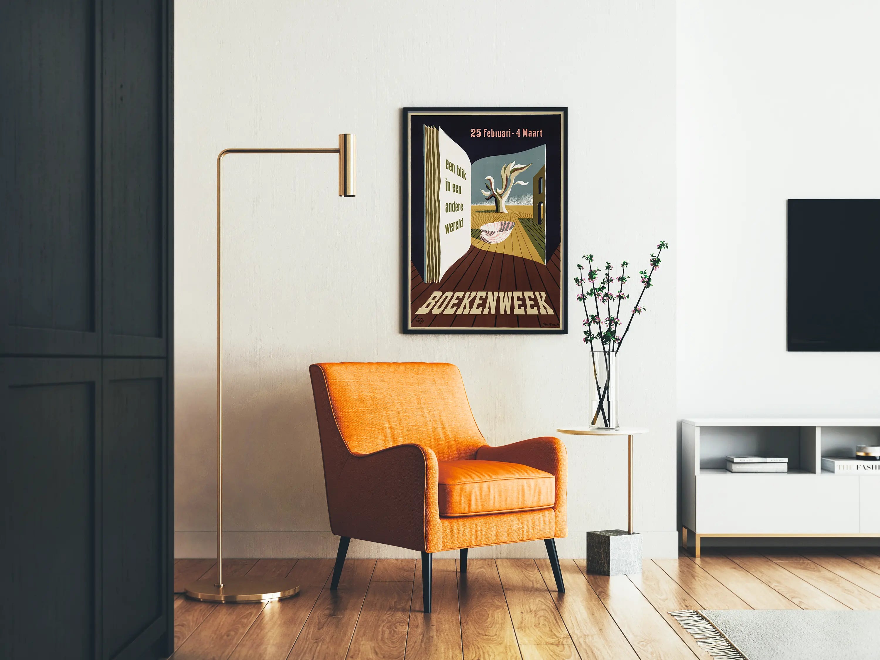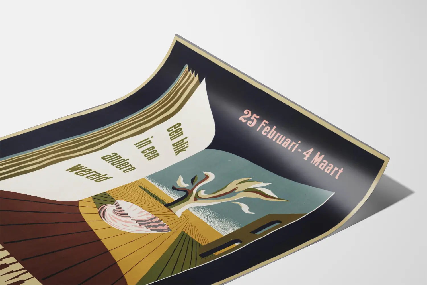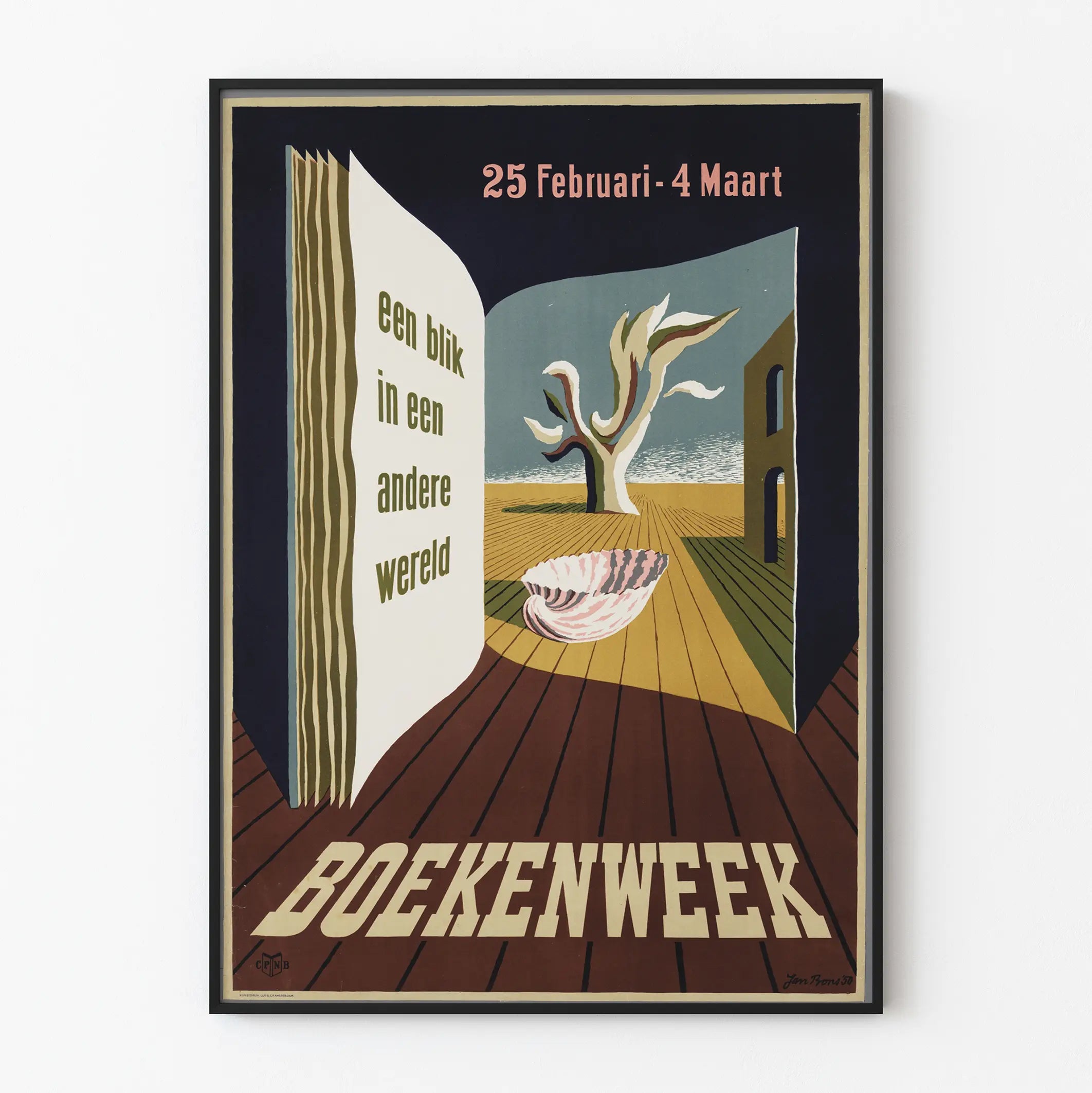 Tämä vintage juliste nimeltä "Boekenweek" vangitsee unenomaisen ja surrealistisen tunnelman, joka sopii täydellisesti hienostuneeseen seinäkoristukseen. Esitettynä hillityissä sävyissä, kuten sininen, okra, vaaleanpunainen ja ruskea, se kuvaa avointa kirjan sivua, josta avautuu epätavallinen maisema, koostuen tyylitellystä puusta ja jättimäisestä simpukasta. Tämä juliste herättää toisen maailman kuvan, täydellisesti sopien tekstin teemaan "katse toisessa maailmassa" (een blik in een andere wereld), muistuttaen kirjallisuuden vaikutuksesta ja lukemisen taikuudesta kirjan viikon aikana, jonka päivämäärät on merkitty yläreunaan (25. helmikuuta - 4. maaliskuuta).
