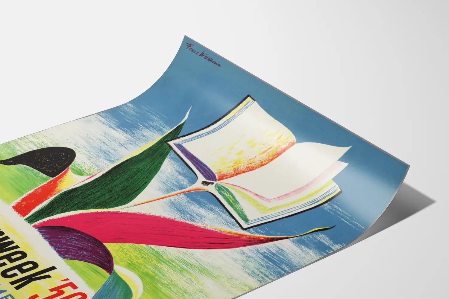 Tämä pystymuodossa oleva juliste on signeerattu Fean Weideman toimesta, jonka tyylitelty piirtotapa luo keveyden ja eleganssin tunteen. Teksti „boekenweek '56 25 FEBR-3 MRT“ kertoo vuosittaisesta kirjallisuustapahtumasta ja sen ajankohdasta, vahvistaen tämän julisteen historiallista ja kulttuurista arvoa. Vasemmassa alakulmassa oleva CPNB-logo lisää aitouden tuntua tähän teokseen.