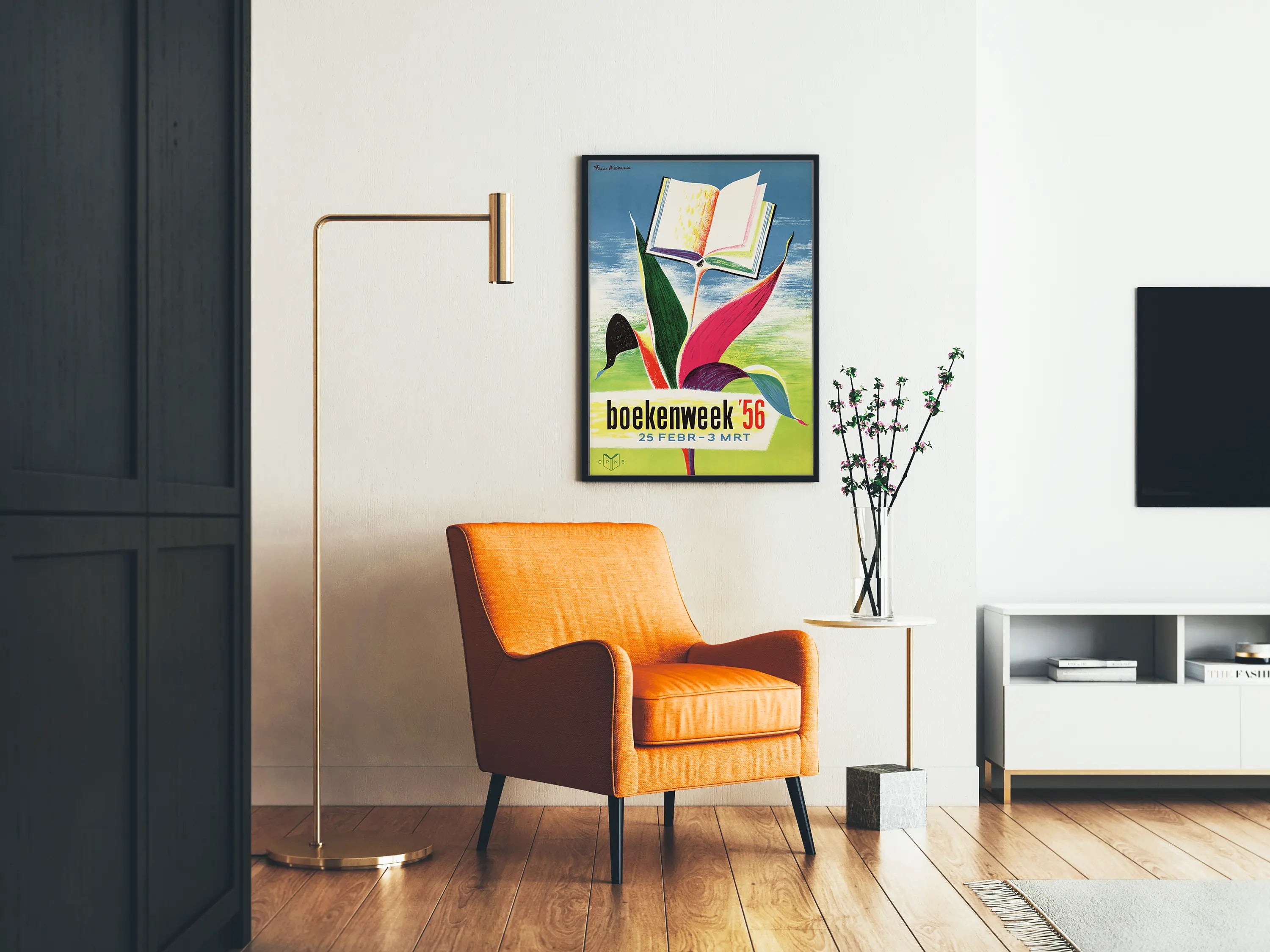 Tämä vintage juliste vuodelta 1956 Boekenweekiin on täydellinen seinäkoriste kirjallisuuden ja retrotaiteen ystäville. Muotoilu esittää avointa kirjaa, joka leijuu varren päällä, muistuttaen värikästä tyyliteltyä kukkaa, yhdistäen luonnon ja kulttuurin runollisessa ja graafisessa kokonaisuudessa. Sinisen ja vihreän asteittain vaihtuvat taustavärit sekä kirkkaat punaiset, tummanvihreät, laventelin ja mustat lehdet korostavat tämän julisteen visuaalista dynaamisuutta.