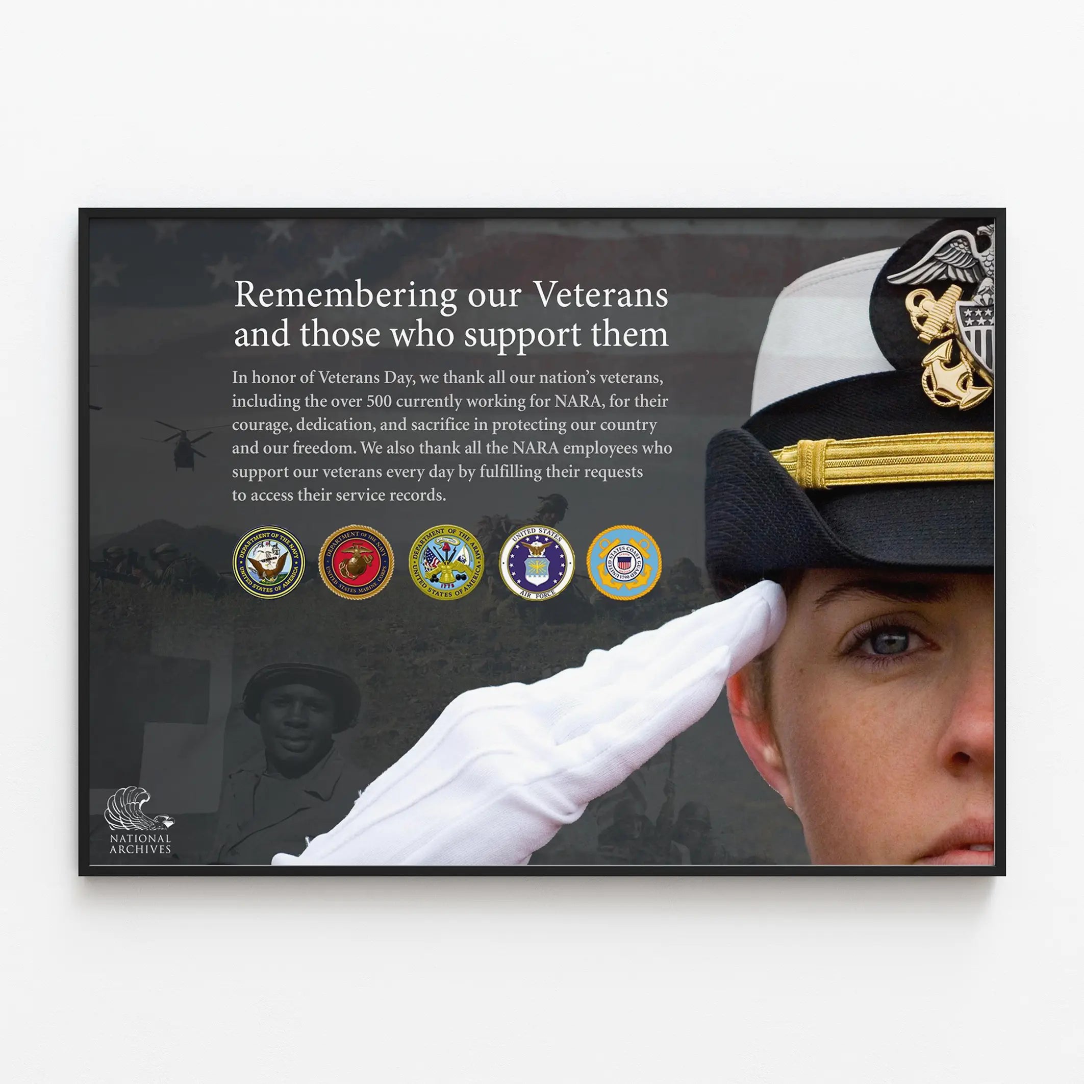 Tämä Veteraanipäivän muistotaulu on ainutlaatuinen seinäkoriste, joka on omistettu veteraanien ja heidän tukijoidensa kunniaksi. Esittäen koskettavan kuvan sotilaasta univormussa tervehtimässä, tämä voimakas visuaalinen elementti korostuu vakavan ja kunnioittavan sävyisen taustan avulla, jossa näkyvät tehtävissä olevat sotilaat ja viralliset tunnukset, jotka edustavat eri amerikkalaisen armeijan haaroja. Julisteen koostumus korostaa englanninkielistä viestiä, joka kunnioittaa veteraanien rohkeutta, omistautumista ja uhrauksia, suojellessaan kansakuntaa ja sen vapautta. Julisteessa viitataan myös kiitollisuuteen omistautuneita työntekijöitä kohtaan, jotka tukevat veteraaneja helpottamalla heidän palvelutietojensa pääsyä. Ihanteellinen institutionaaliseen, opetukselliseen tai henkilökohtaiseen seinäkoristukseen, tämä juliste luo juhlallisen ja kunnioittavan ilmapiirin esittelytiloihin. Sen käyttö on täydellistä juhlissa, muistotilaisuuksissa tai koriste-elementtinä, joka lisää tietoisuutta ja muistuttaa veteraanien tärkeydestä yhteiskunnassa. Julisteen alaosassa olevat viralliset tunnukset lisäävät aitouden tuntua ja vahvistavat viestin virallista luonnetta. Yhteenvetona tämä seinätaulu on symbolinen valinta kunnioittaa sotilasheroja, antaa merkitystä sisustukselle ja edistää muistoa ja kunnioitusta merkityksellisen kuvan ja sitoutuneen tekstin kautta.
