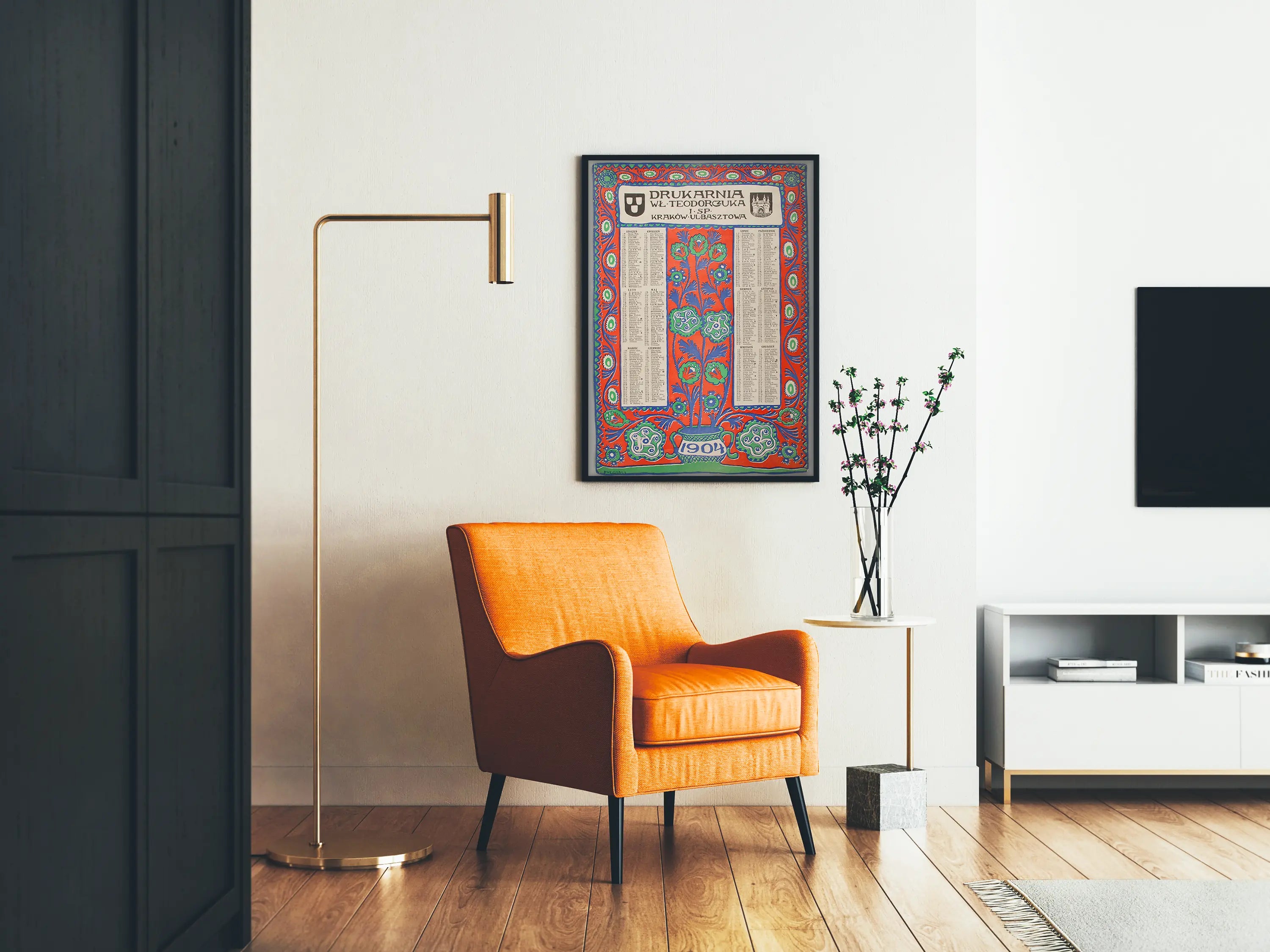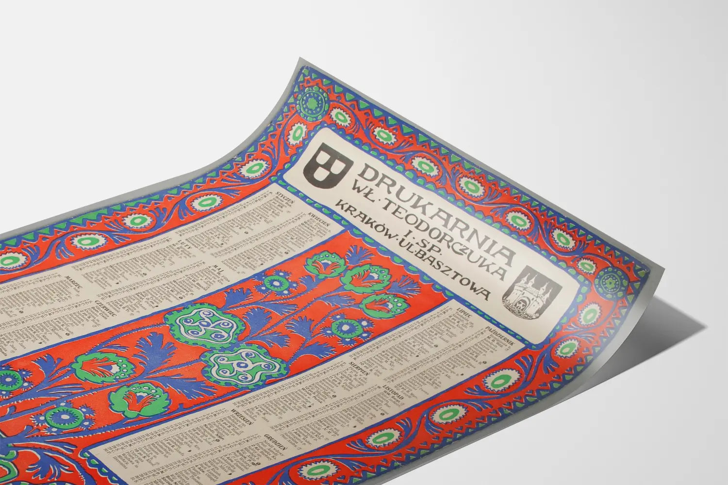 Tämä koristeellinen juliste esittää seinäkalenterin vuodelta 1904, joka on painettu Puolassa, ja edustaa Art Nouveau -tyyliä, jota leimaavat tyylitellyt kukkamuodot ja eloisat värit. Jokainen vuoden kuukausi on järjestetty erillisiin, erittäin selkeisiin sarakkeisiin, tarjoten helppolukuisen ja selkeän katselukokemuksen, jossa näkyvät päivien ja juhlapyhien nimet puolaksi. Teoksen keskellä kohoaa suuri kukkivä maljakko, joka on piirretty sinisen, vihreän ja oranssinpunaisen sävyissä, ja joka viittaa perinteisen estetiikan ja taiteellisen koristelun yhdistelmään, joka oli tyypillistä tuolle ajalle. Julisteen kehys on koristeltu toistuvalla kukkakuviolla, joka luo visuaalista harmoniaa ja kiinnittää katseen, samalla vahvistaen teoksen vintage-efektiä. Julisteen yläosassa näkyvät vanhat typografiset kirjoitukset, jotka kertovat alkuperäisestä painotalosta Krakovassa, lisäten autenttisen ja historiallisesti arvokkaan sävyn tähän seinäkoristukseen. Tämä juliste on täydellinen retro-tyylin ystäville, 1900-luvun alun graafisen taiteen harrastajille ja epätavalliselle seinäkoristeelle, tuoden tilaan sekä väriä että kulttuurista vivahdetta. Seinäkoristeena tämä kalenteri tarjoaa ainutlaatuisen tyylin, joka sopii täydellisesti boheemiin, vintage- tai etniseen tunnelmaan. Se on erinomainen sisustuselementti toimistoon, kirjastoon tai olohuoneeseen, ja kutsuu aikamatkalle samalla kun se kaunistaa tilaa intensiivisillä väreillään ja orgaanisilla muodoillaan. Tämä pystysuuntainen seinätaulu erottuu historiallisena ja taiteellisena kuvauksena, ja on ihanteellinen vanhojen julisteiden kokoelman rikastuttamiseen tai tilan persoonalliseen ja tyylikkääseen muokkaamiseen.