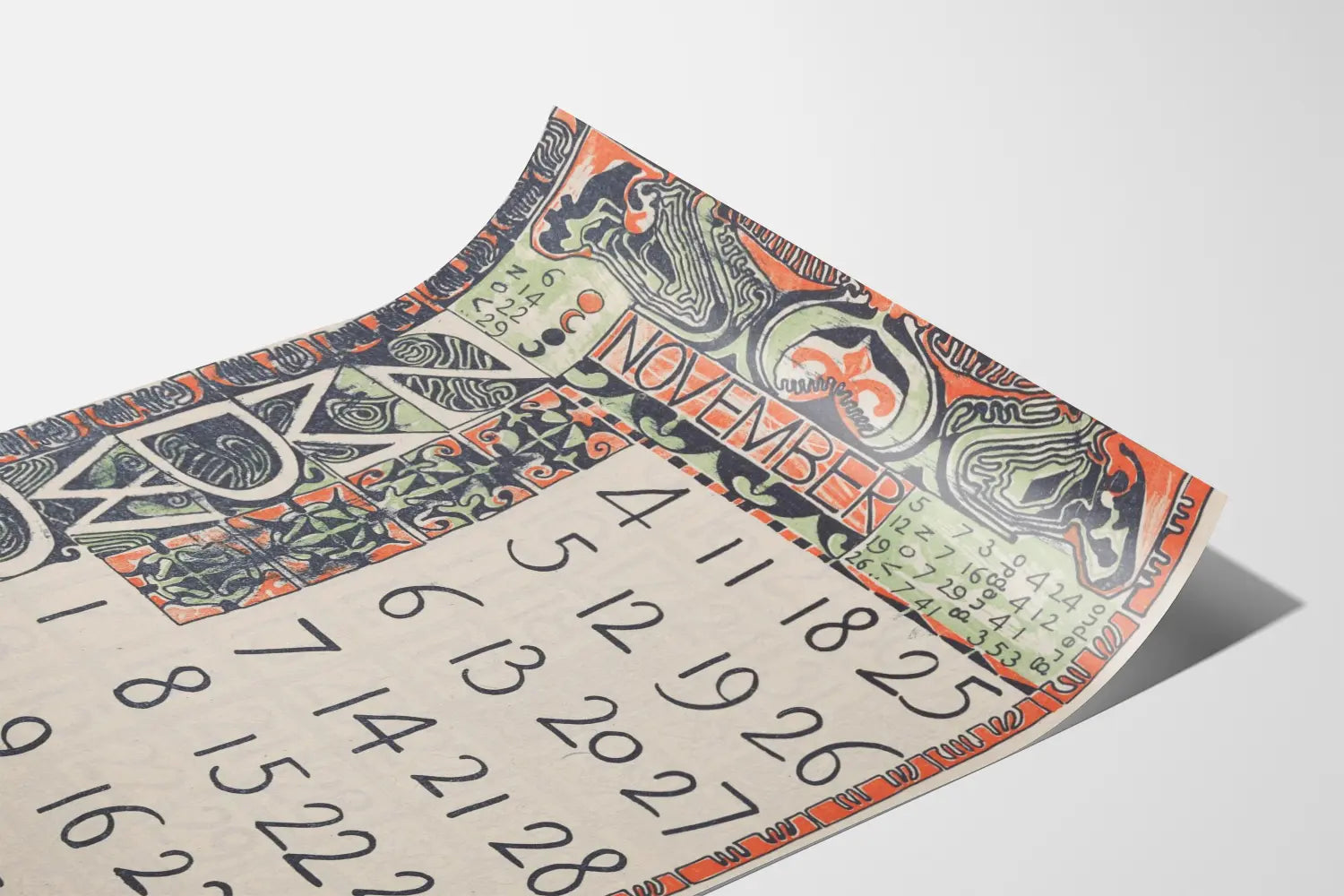 Tutustu tähän marraskuun 1900 kalenterijulisteeseen, joka on kuvattu tyypillisellä Art Nouveau -tyylillä, korostaen kukkakuvioita ja elegantteja kaaria. Tämä seinäkoriste yhdistää vintage-grafiikan klassisiin väreihin, joissa on vihreän, oranssin ja mustan sävyjä, ja ne on upotettu koristeellisiin elementteihin, jotka harmonisesti kehystävät kalenteria. Tämä juliste esittää marraskuun päivät selkeästi ja rivissä, ja viikonpäivien alkukirjaimet on kirjoitettu pystysuoraan vasemmalle puolelle koristeellisella kirjasintyypillä. Julisteen kehys on runsaasti koristeltu, viitaten vanhaan taiteelliseen maailmaan, ja se sopii täydellisesti seinäkoristeeksi, joka tuo ripauksen retroa ja taiteellisuutta sisustukseesi. Täydellinen klassisen muotoilun ja historiallisten painatusten ystäville, tämä kalenteritaulu yhdistää käytännöllisyyden ja estetiikan yhdeksi ripustettavaksi koriste-esineeksi. Tämä juliste on ainutlaatuinen sisustuselementti toimistolle, kirjastoon tai olohuoneeseen, ja se luo aikakauden tunnelmaa monimutkaisilla kuvioillaan ja vanhalla typografialla. Lisää tämä juliste vintage-seinäkoristeiden kokoelmaasi rikastuttaaksesi seinäsi aitouden ja eleganssin ilmapiirillä.