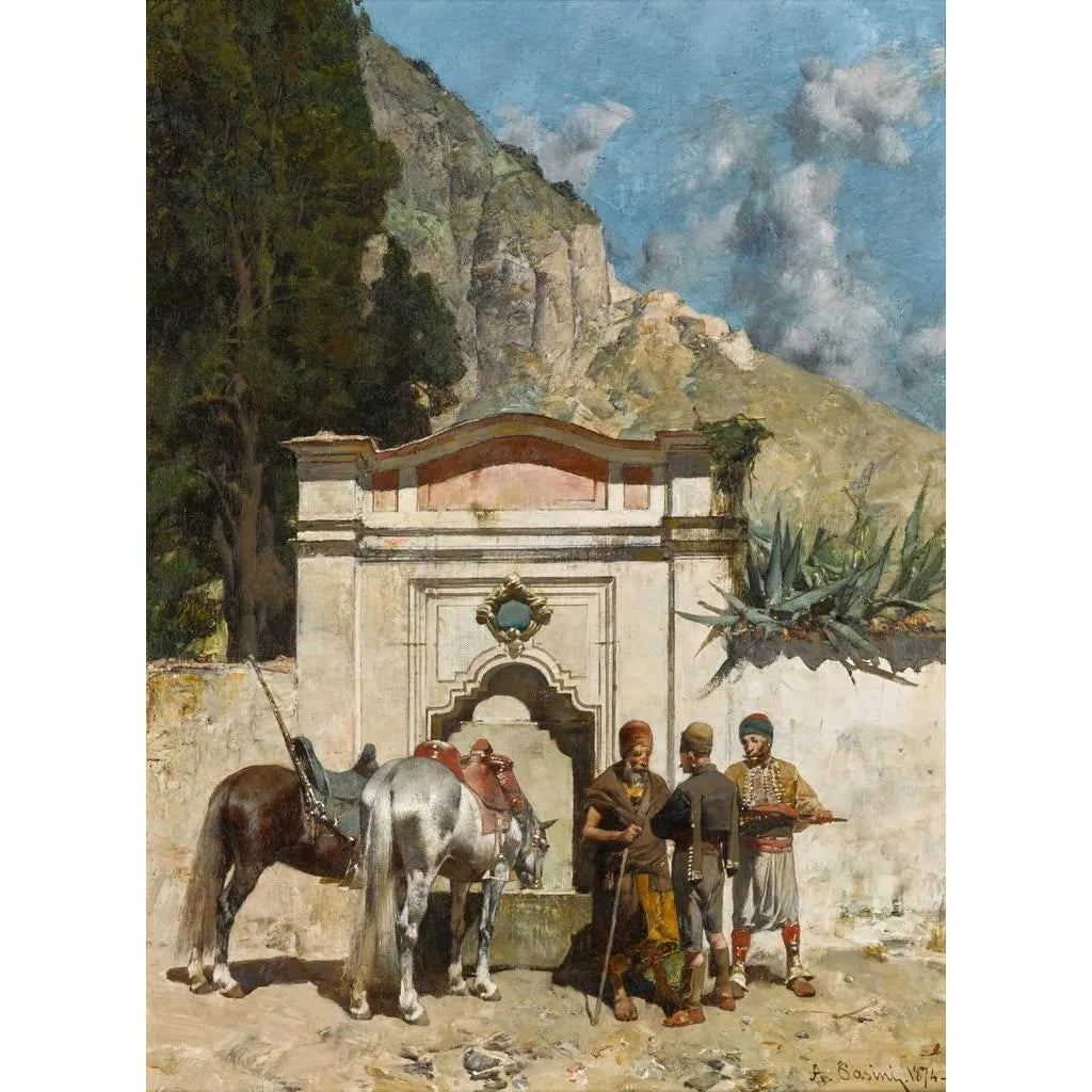 Alberto Pasini, né en 1826, est un peintre italien qui a su s'imposer dans le courant orientaliste du XIXe siècle. Sa passion pour les voyages l'a conduit à explorer des régions telles que l'Égypte et l'Algérie, influençant profondément son œuvre. En intégrant des éléments de la culture locale et des paysages exotiques, Pasini a su créer des tableaux qui racontent des histoires tout en capturant la beauté de ces contrées. Son travail a été salué pour sa capacité à allier réalisme et romantisme, offrant ainsi une vision unique de l'Orient à ses contemporains.
