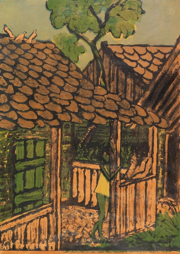 Taidetuloste | Kaksi romani-lasta mökin edessä - Otto Mueller