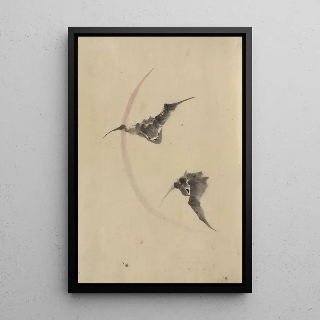 Katsushika Hokusai, né en 1760, est l'un des artistes les plus influents du Japon, reconnu pour son rôle majeur dans le mouvement ukiyo-e. Sa carrière s'étend sur plusieurs décennies, durant lesquelles il a exploré divers thèmes, allant des paysages aux portraits et aux scènes de la vie quotidienne. Hokusai a été profondément influencé par la nature et la culture populaire de son époque, ce qui se reflète dans son travail. Ses œuvres, dont la célèbre Grande Vague de Kanagawa, ont laissé une empreinte indélébile sur l'art japonais et ont inspiré de nombreux artistes occidentaux. Deux chauves-souris en vol s'inscrit dans cette tradition, témoignant de son habileté à marier technique et symbolisme.
