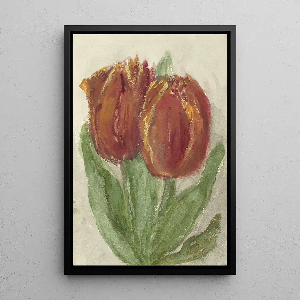 Tässä kiehtovassa teoksessa Sientje Mesdag van Houten tarjoaa kukkakuvituksen, jossa kaksi punaista tulppaania kohoaa ylpeinä, loistavien sävyjen valaisemina. Taiteilijan taito, joka yhdistää taitavasti öljyn kankaalle, luo elävän ja dynaamisen ilmapiirin. Herkät terälehdet, tarkkoine ääriviivoineen, tuntuvat lähes kosketeltavilta, kun taas epätarkka tausta korostaa kukkien kauneutta. Tämä taidegrafiikka 'Kaksi punaista tulppaania' kutsuu rauhalliseen pohdiskeluun, jossa jokainen yksityiskohta on luonnon juhla.
