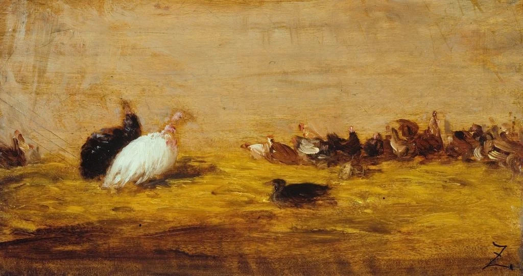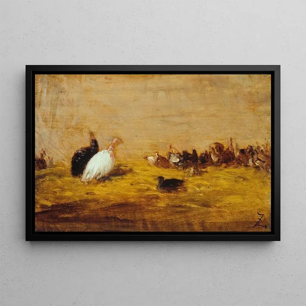 Dans cette œuvre vibrante, Félix Ziem nous plonge au cœur d'une nature animée où les dindons, majestueux et colorés, se déplacent avec grâce. La composition est soigneusement orchestrée, mêlant des teintes chaudes de terre et des éclats de couleurs vives qui évoquent la richesse de la faune. La technique picturale, caractéristique de Ziem, combine des coups de pinceau fluides et des détails précis, créant une atmosphère à la fois sereine et dynamique. Ce tableau invite à une contemplation attentive, où chaque élément contribue à l'harmonie générale de la scène.