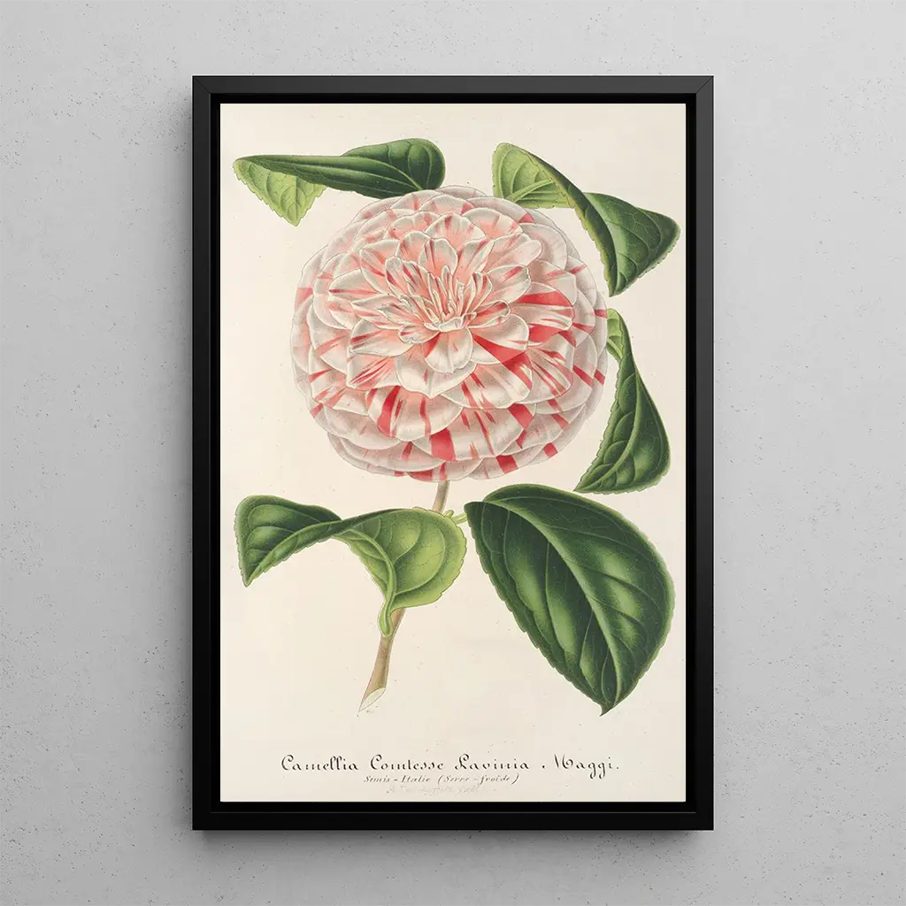 Tässä Camellia Comtesse Lavinia Maggi -taidegrafiikan uudelleenvedoksessa Charles Antoine Lemaire kuljettaa meidät kukkivaan maailmaan, jossa on ääretön hienostuneisuus. Kompositio, joka on hienovaraisesti tasapainotettu, korostaa kamelian majesteettisuutta, jonka pehmeän sävyiset terälehdet viittaavat kevään lempeyteen. Ruusun ja valkoisen sävyt sekoittuvat harmonisesti, luoden rauhoittavan ja uneksivan ilmapiirin. Lemairen tekniikka, joka yhdistää tarkkuuden ja herkkyyden, herättää jokaisen yksityiskohdan eloon, tehden lähes kosketeltavaksi kukkien samettisen tekstuurin. Tämä teos on todellinen kutsu mietiskelyyn, hetki, jolloin luonto ilmaisee koko loistonsa.