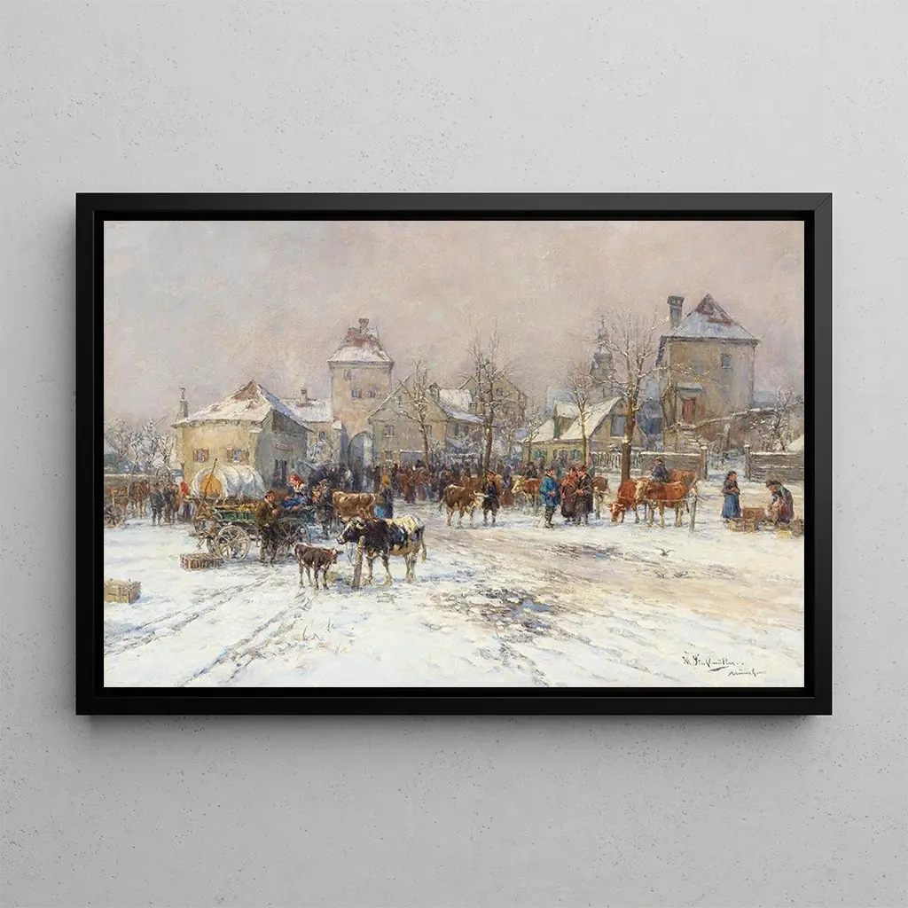 Tässä taidegrafiikan "Markkinat karjalle talvella" uudelleenluonnoksessa Karl Stuhlmüller vangitsee vilkkaan päivän olemuksen maaseututorilla. Talven kylmät sävyt sekoittuvat lämpimiin väreihin, luoden vaikuttavan kontrastin. Hahmot, pukeutuneina paksuihin takkeihin, vaikuttavat kiirehtivän eläinten ympärillä, kun lumi peittää maan, lisäten kohtaukseen runollisen ulottuvuuden. Stuhlmüllerin tekniikka, joka yhdistää realismia ja impressionismia, herättää tämän elävän ilmapiirin henkiin, jossa jokainen yksityiskohta, kasvoista eläimiin, kertoo tarinan.