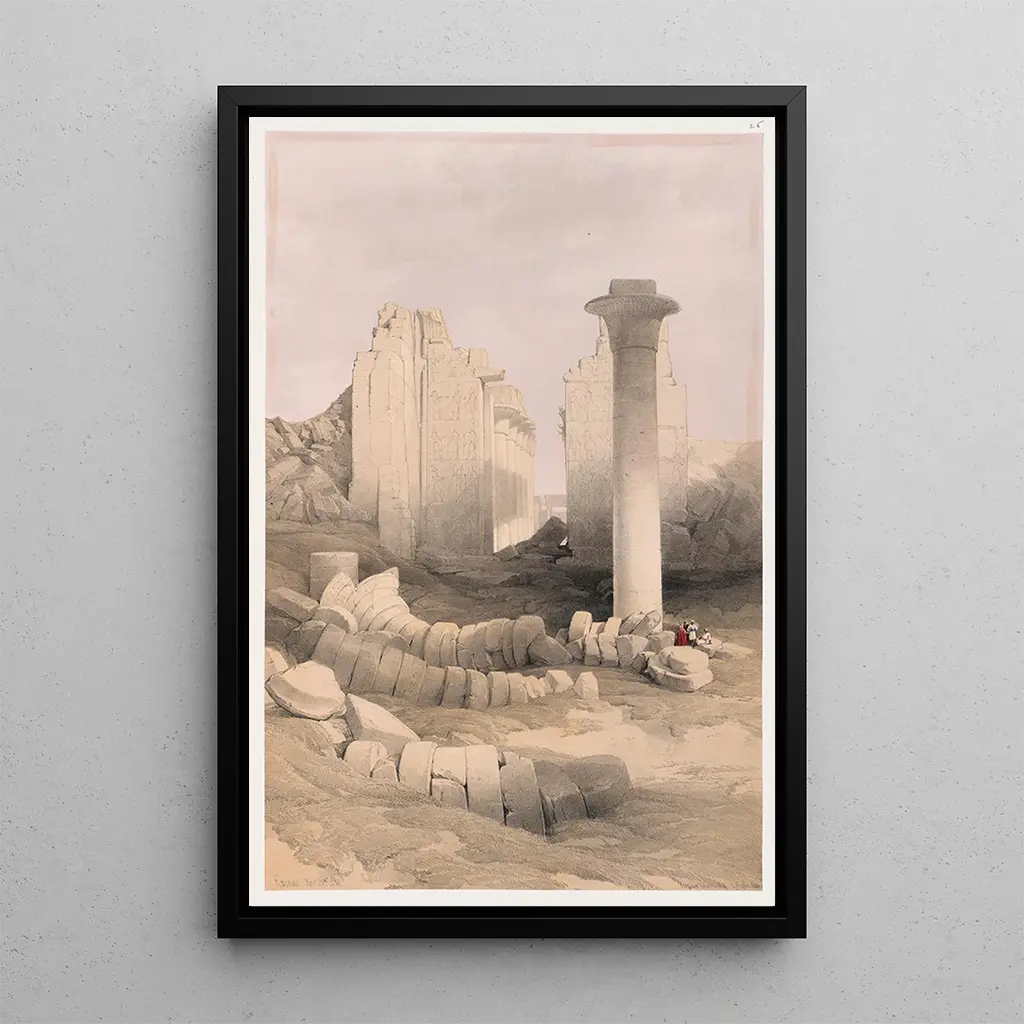Karnak 29 marraskuun 1838 taidegrafiikka sukeltaa egyptiläisten majesteettisten temppeleiden sydämeen. David Roberts, yksityiskohtien hallussaan, vangitsee pylväiden valtavuuden ja kultaisen valon, joka hyväilee muinaisten kivien pintaa. Lämmintä värimaailmaa, jossa okran ja syvien sinisten sävyt sekoittuvat, luovat mystisen, lähes pyhän tunnelman. Jokainen taideteoksen elementti vaikuttaa kertovan tarinan, sellaista sivilisaatiota, joka haastoi ajan. Teos kutsuu mietiskelyyn, pakomatkaan maailmaan, jossa historia ja kauneus kohtaavat.