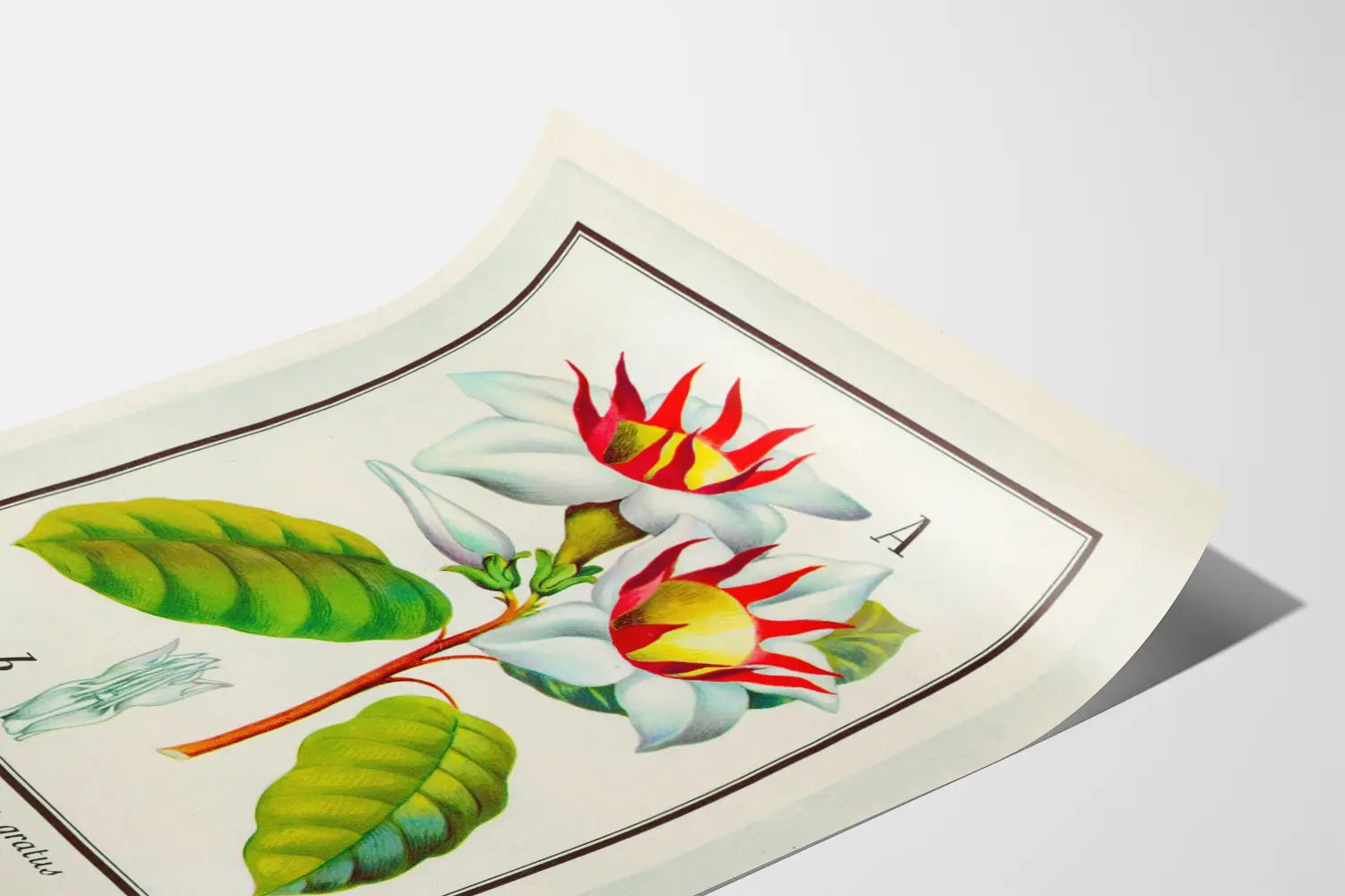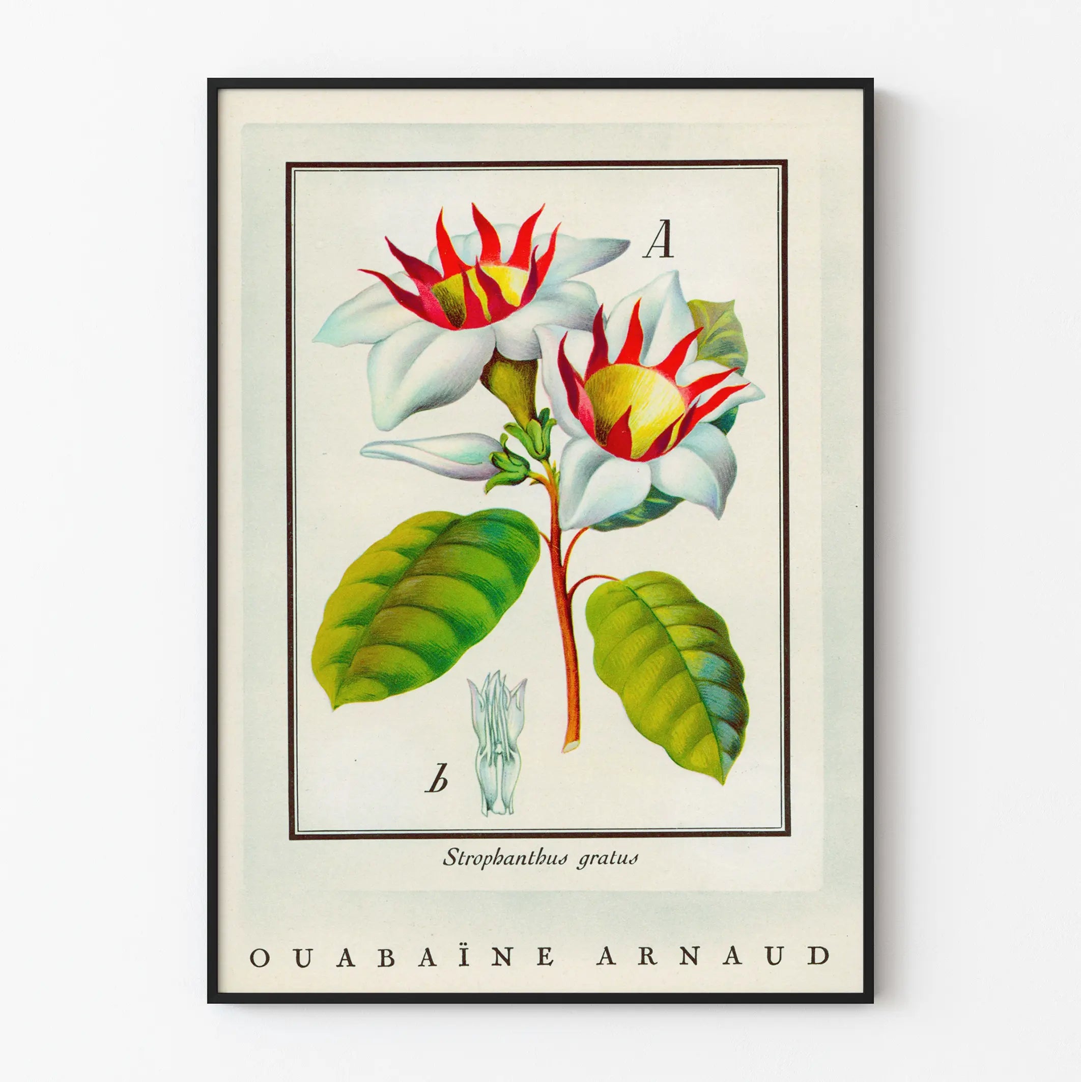 Lisää sisustukseesi ripaus eleganssia ja luonnollisuutta tämän vintage-kasvokuvan avulla, joka esittää Strophanthus gratus -kukan, tunnetaan myös nimellä Ouabaïne Arnaud. Tämä juliste on upea seinäkoriste, joka yhdistää klassisen estetiikan ja luonnon kauneuden. Huolellisesti piirretyt yksityiskohdat korostavat kahta valkoista kukkaa, joissa on herkät ja loistavat terälehdet, keltaiset keskukset punaisine raidoineen ja ympärillä suuret vihreät lehdet, jotka kohoavat ohuella varrella. Tämä kasvitieteellinen taulu muistuttaa vanhojen kuvataiteellisten levyjen tieteellisestä tarkkuudesta, tehden siitä täydellisen kasvien ja retro-tyylisen sisustuksen ystäville.