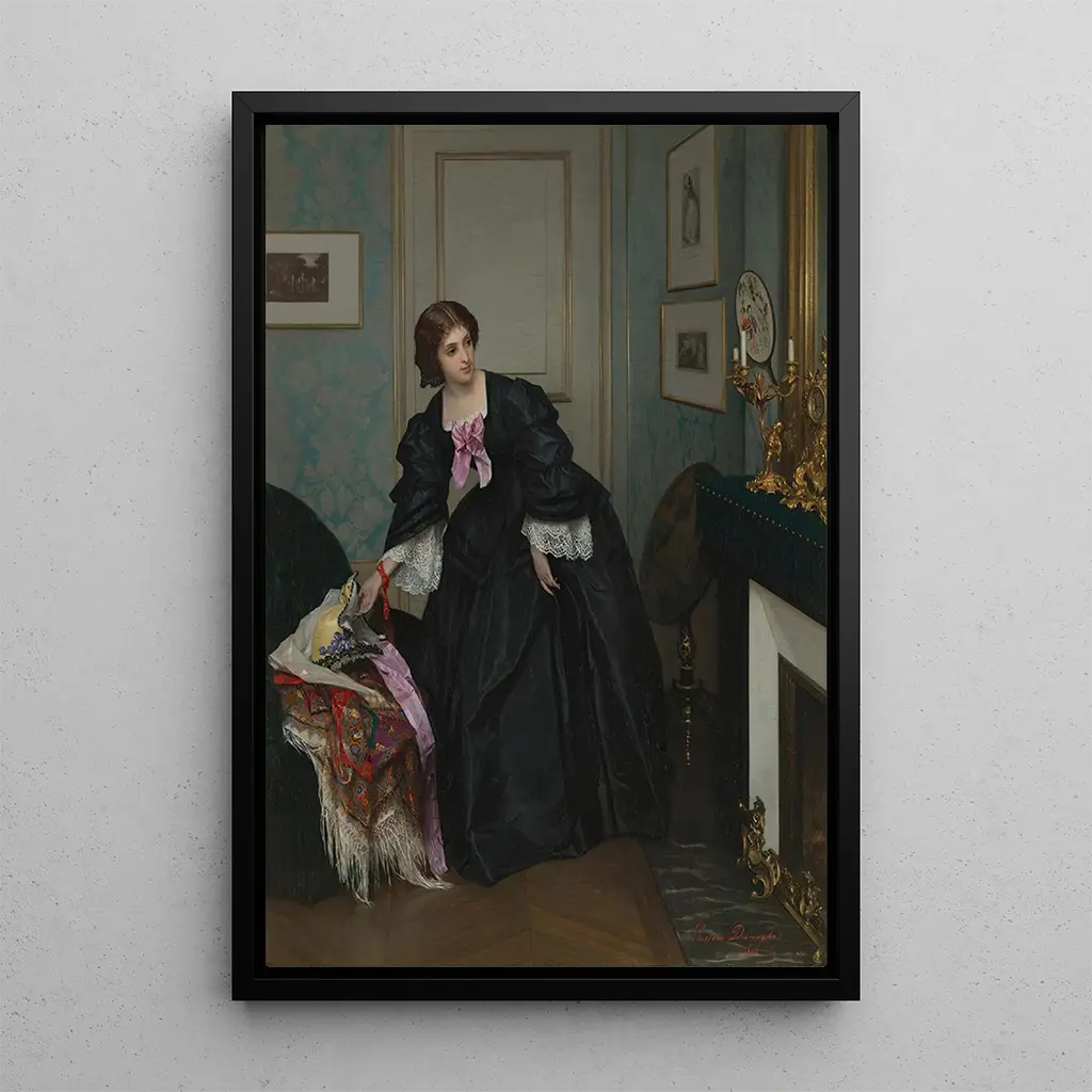 Tässä taidegrafiikan reproduksessa Katso aikaa Gustave Léonard de Jonghe luo tunnelman, joka on täynnä lempeyttä ja melankoliaa. Kompositio korostaa pohdiskelevaa naista, joka on uppoutunut ajatuksiinsa, kun taas himmeä valo kylpee kohtauksen. Pastellivärit ja hienostuneet yksityiskohdat luovat intiimin, melkein unenomaisen tunnelman. Jonghen tekniikka, joka yhdistää realismia ja herkkyyttä, mahdollistaa tunteen kokemisen, joka kumpuaa tästä taideteoksesta, kutsuen katsojan jakamaan hetken pohdintaa.