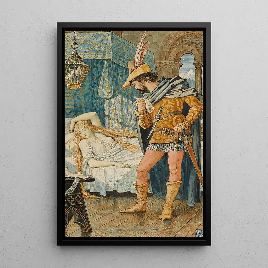Tässä La Belle au bois dormant -taidegrafiikan reproduktiossa Walter Crane johdattaa meidät satujen maailmaan, jossa pastellivärit sekoittuvat harmonisesti. Hahmot, hienovaraisesti luonnostellut, näyttävät leijuvan unessa, kun taas kukkakuvioinnit ja arabeskit lisäävät taideteokseen taianomaista tunnelmaa. Crane:n tekniikka, yhdistäen vesiväriä ja kaiverrusta, luo pehmeän ja lumoavan ilmapiirin, kutsuen katsojan uppoutumaan ajattomaan satuun. Jokainen yksityiskohta, prinsessojen mekoista reheviin lehtiin, on kunnianosoitus kauneudelle ja mielikuvitukselle.