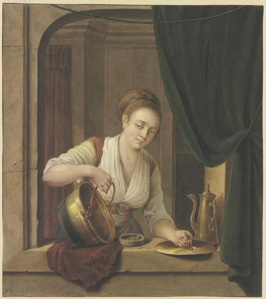 Kokki puhdistaa astioita ikkunalla - Pieter Recco