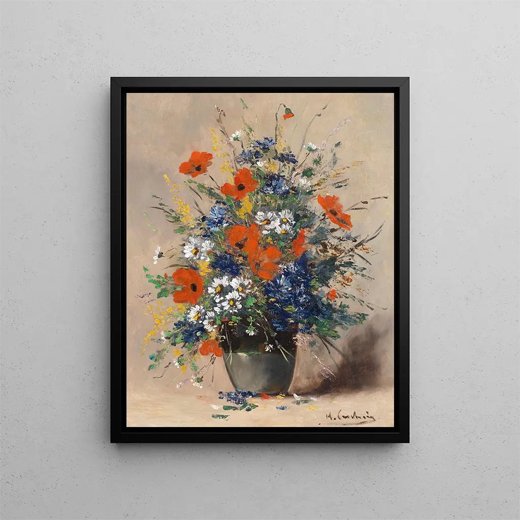 Väkevässä kukkamaailman maailmassa "Kesäkimppu - Eugène Henri Cauchois" erottuu luonnon juhlinnan kautta. Tämä teos, täynnä valoa ja väriä, muistuttaa lempeistä kesäpäivistä, jolloin kukat kukkivat loistossaan. Cauchois, omaa kykyään epäilemättä, onnistuu vangitsemaan näiden ohikiitävien hetkien olemuksen, joissa kukkien hetkellinen kauneus yhdistyy taiteen pysyvyyteen. Katsellessaan tätä teosta katsoja siirtyy rehevään puutarhaan, jossa jokainen terälehti ja lehti kertoo tarinan, luoden hiljaisen dialogin luonnon ja taiteen välillä.