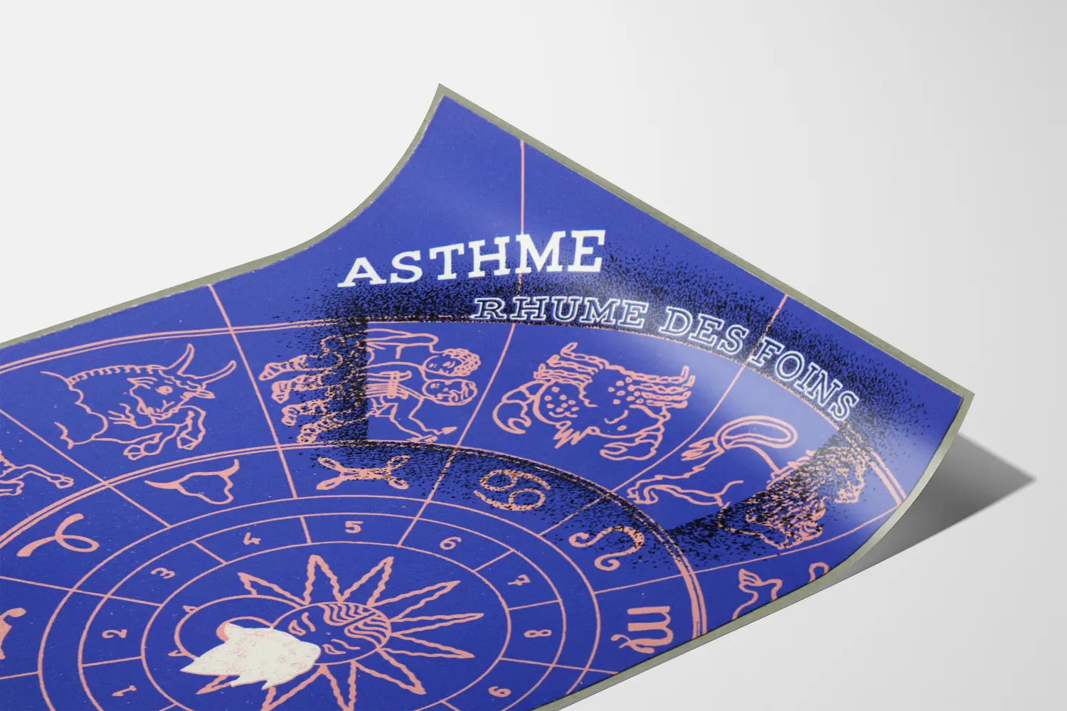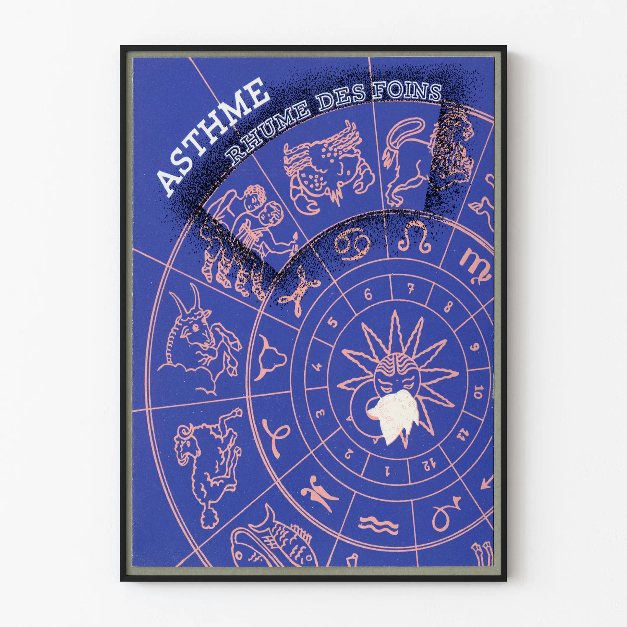 Tutustu tähän ainutlaatuiseen vintage-plakaattiin, joka kuvaa astman ja heinänuhan teemaa. Erinomainen omaleimaisen seinäkoristeen luomiseen, tämä juliste esittää tyylitellyn astrologisen pyörän sinisen ja vaaleanpunaisen sävyissä, jossa keskellä on aurinko, joka kantaa nenäliinaa – symboloiden allergiaoireita. Iskulauseet isoilla kirjaimilla korostavat sanoja „ASTMA” ja „HEINÄNUHA”, tehden tästä teoksesta sekä koristeellisen että opettavaisen.