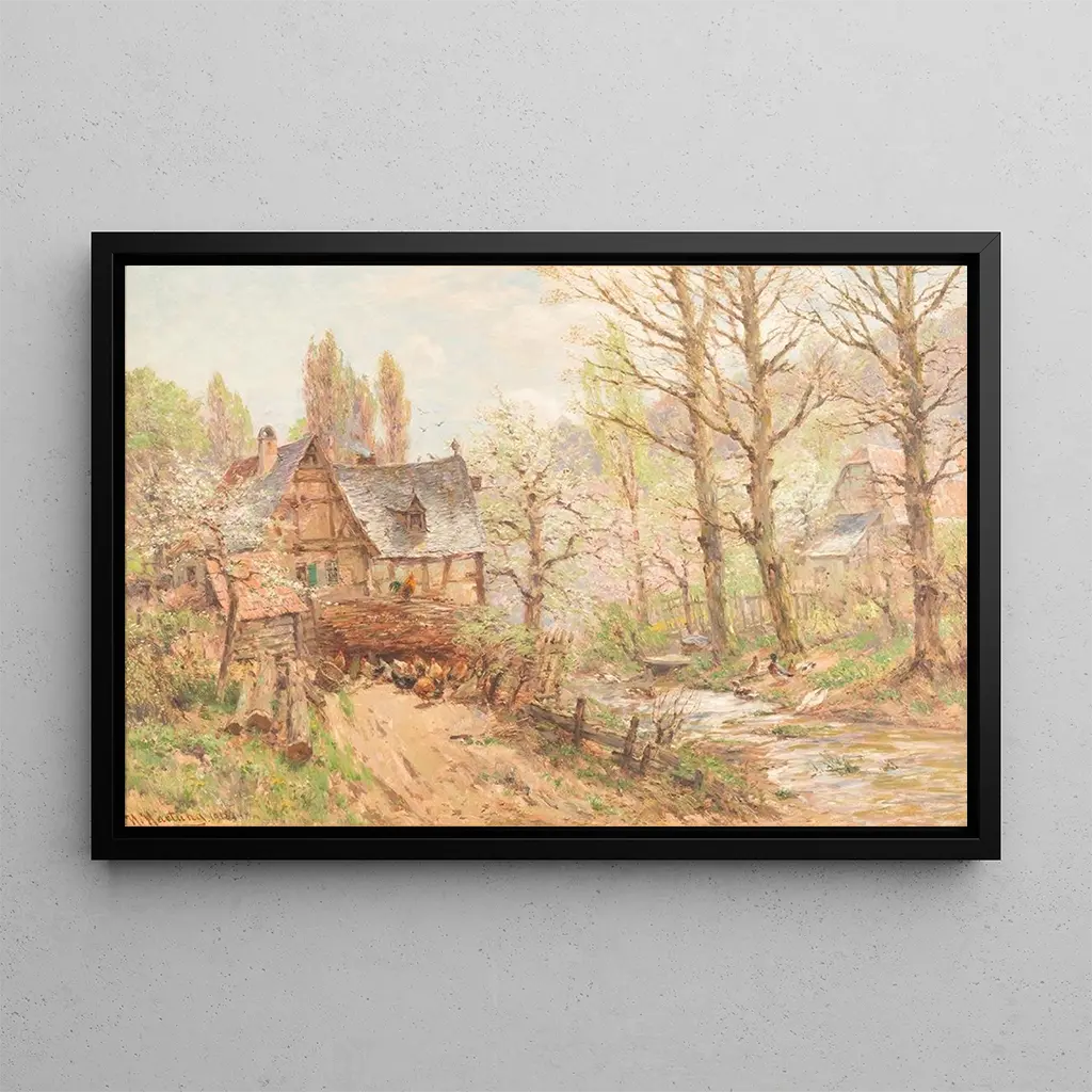 Ferme au printemps : une ode à la renaissance de la nature La toile "Ferme au printemps" de Heinrich Hartung évoque une scène bucolique où la nature se réveille avec éclat. Les couleurs vives et les nuances de vert, de jaune et de bleu se mêlent harmonieusement, créant une atmosphère joyeuse et apaisante. La composition, centrée sur une ferme entourée de champs en fleurs, invite le spectateur à plonger dans ce paysage idyllique. Hartung utilise une technique de peinture à l'huile qui donne vie aux détails, des arbres majestueux aux fleurs délicates, tout en transmettant une sensation de sérénité et de renouveau. Ce tableau est une véritable célébration de la beauté printanière. Heinrich Hartung : un maître de la nature au XXe siècle Heinrich Hartung, peintre allemand du XXe siècle, est reconnu pour sa capacité à capturer la beauté des paysages ruraux. Influencé par le mouvement impressionniste, il a su développer un style personnel qui allie réalisme et poésie. Hartung a consacré sa carrière à représenter la nature, cherchant à immortaliser la lumière et les couleurs des saisons. Son œuvre reflète une époque où l'artiste se tourne vers la nature pour trouver inspiration et réconfort, en réponse aux bouleversements du monde moderne. "Ferme au printemps" s'inscrit parfaitement dans cette démarche, témoignant de son engagement envers la beauté du monde naturel. Une acquisition décorative aux multiples atouts La taidegrafiikka de "Ferme au printemps" est un choix idéal pour apporter une touche de fraîcheur et de sérénité à votre intérieur. Que ce soit dans un salon, un bureau ou une chambre, ce tableau invite à la contemplation et à la rêverie. Sa qualité de taidegrafiikka garantit une fidélité aux couleurs et aux détails de l'œuvre originale, tout en offrant un attrait esthétique indéniable. En choisissant cette toile, vous optez pour une décoration qui évoque la douceur de la nature et la beauté des saisons, créant ainsi une atmosphère chaleureuse et accueillante dans votre espace de vie.