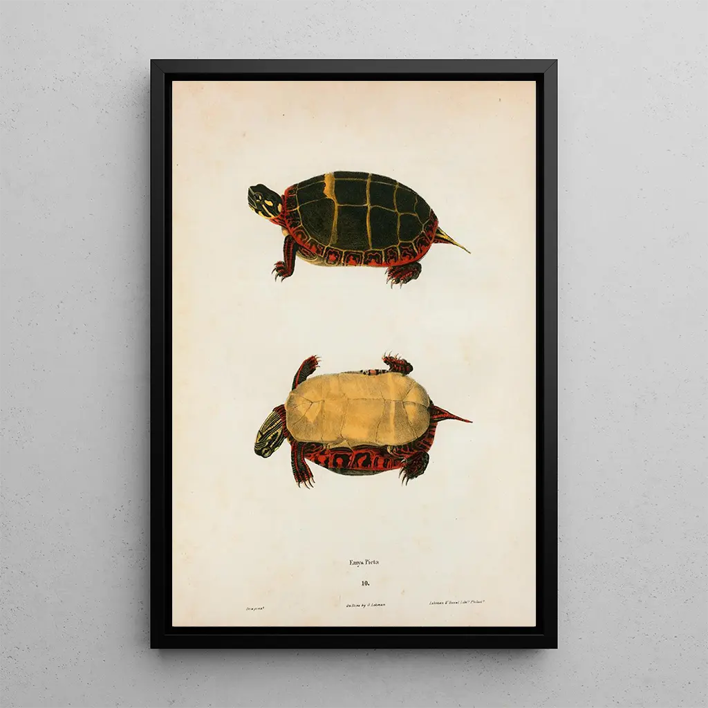 Tortu dentelée -taidegrafiikan, John Edwards Holbrookin ikoninen teos, johdattaa meidät kiehtovaan maailmaan, jossa eläinlajin kauneus paljastuu hienovaraisesti. Pansaan yksityiskohtaiset kuviot, jotka koristavat kuorta, vangitsevat valon tavalla, joka herättää mielenrauhaa vesistöjen ympäristöissä. Vihreiden ja ruskeiden sävyjen harmoninen yhdistelmä luo rauhoittavan ilmapiirin. Vesiväritekniikka, jota käytetään mestarillisesti, kunnioittaa tätä majesteettista eläintä ja kutsuu katsojan syvälliseen ja kunnioittavaan luonnon pohdintaan.