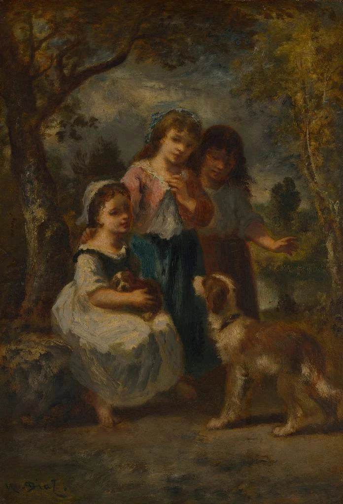 Narcisse Virgile Diaz de la Peña, syntynyt Pariisissa vuonna 1807, tunnetaan kyvystään ikuistaa arkipäivän kohtauksia, erityisesti luonnon ja lapsuuden kuvaamisessa. Romantismin vaikutuksesta hän kehittää tyylin, joka yhdistää realismia ja impressionismia, pyrkien välittämään tunteita teostensa kautta. Diaz on myös merkittävä Barbizon-koulukunnan jäsen, liike, joka arvostaa maalaamista ulkona ja luonnon suoraa havainnointia. Trois petites filles -teos kuvaa täydellisesti hänen kykyään herättää hellyyden ja yksinkertaisuuden hetkiä, tehden hänestä XIX-luvun merkittävän taiteilijan.