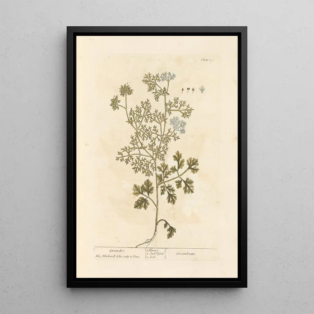 Coriandren {{Elizabeth Blackwell}} taidegrafiikka on teos, joka herättää raikkauden ja kasvien elinvoiman. Tämä herkkä kuvaus korostaa korianterin lehtiä ja kukkia, vangiten niiden olemuksen poikkeuksellisella tarkkuudella. Vihreän ja valkoisen sävyt, yhdistettynä huolellisiin yksityiskohtiin, luovat elävän ja iloisen tunnelman. Vesiväritekniikka, jota on käytetty huolellisesti, antaa tälle kankaalle keveyttä, joka muistuttaa kukkivia puutarhoja ja kutsuu tutustumaan luonnon ihmeisiin.