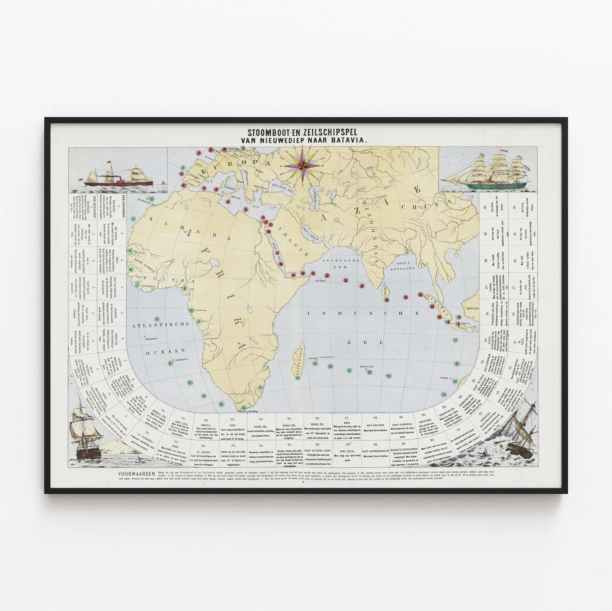 Tämä vintage-karttitaulu kuvaa historiallista meriteitä Nieuwediepistä Batavialle, esittäen kaksintaistelun höyrylaivan ja perinteisen purjealuksen välillä. Tämä seinäkoristejuliste sisältää yksityiskohtaisen merikarttan reitin Atlantin, Afrikan rannikkomerien ja Intian valtameren yli, päätyen Javan saarelle Kaakkois-Aasiassa. Täydellinen merenkulkun, merihistorian tai seikkailun harrastajille, tämä seinätaulu tuo tilaan eleganssia ja aitoutta. Kartta sisältää tarkat merkinnät eri pysähdyksistä numeroin ja hollannin kielellä olevat kuvaukset, jotka dokumentoivat matkan tärkeimmät vaiheet. Suunnitteluun sisältyy huolellisesti piirretyt kuvat kahdesta aluksen tyypistä: ylävasemmalla höyrylaiva ja yläoikealla kolmimastoinen purjealus, lisäten esteettistä ja informatiivista arvoa tähän seinäkoristeeseen. Hellävaraiset värit ja vintage-heijastukset antavat tälle julisteelle vanhan ajan ilmeen, joka sopii harmonisesti mihin tahansa klassiseen tai moderniin sisustukseen. Käytettynä koristeena tämä merikartta kutsuu löytöretkille ja unelmointiin menneistä matkoista, herättäen mielikuvia seikkailuista aalloilla ja purje- sekä höyrylaivan viehätyksestä. Se sopii erinomaisesti olohuoneisiin, työhuoneisiin tai meriaiheisiin tiloihin, jotka liittyvät matkailuun ja tutkimukseen. Yhteenvetona tämä karttaseinäkoriste on täydellinen valinta rikastuttamaan kotiasi ainutlaatuisella julisteella, joka yhdistää historian, taiteen ja merikulttuurin.