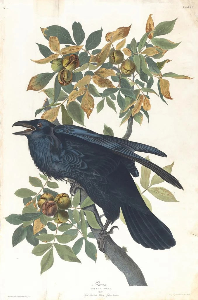 John James Audubonin maalaus Corbeau vangitsee tämän kiehtovan linnun olemuksen. Tarkkojen yksityiskohtien avulla taiteilija korostaa kiiltävän mustaa höyhennystään, joka kontrastoi taustan sinisen ja vihreän sävyjen kanssa. Vesiväritekniikka, yhdistettynä tarkkoihin piirteisiin, herättää tämän ikonisen linnun eloon. Teoksen välittämä tunnelma on sekä salaperäinen että majesteettinen, kutsuen katsojan pohtimaan tämän eläimen symboliikkaa, joka usein yhdistetään viisauteen ja tietoon.