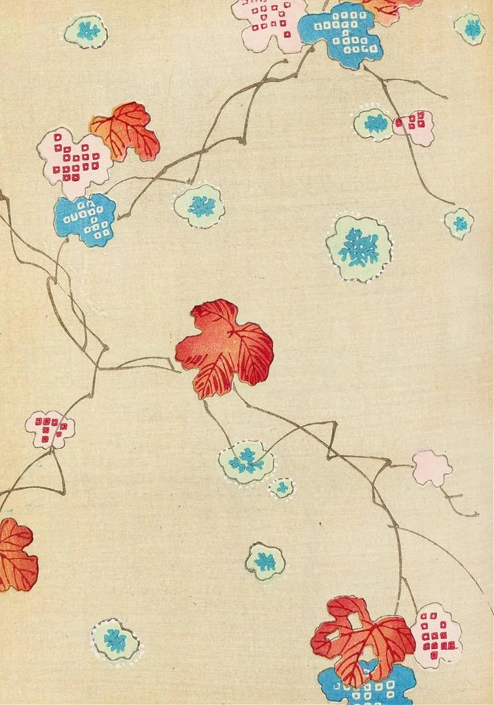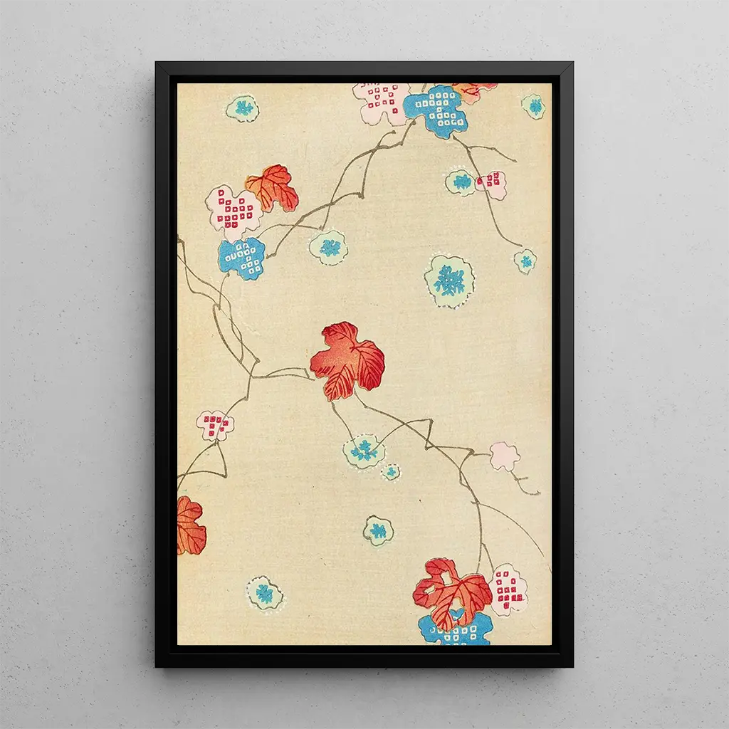 La taidegrafiikkaa de Bijutsukai Pl48 kutsuu sensorisen matkan läpi maailman, jossa värit hehkuvat ja muodot kietoutuvat toisiinsa. Tämä taideteos, joka on täynnä hienostuneisuutta, käyttää rikkaan ja vivahteikkaan paletin, yhdistäen räiskyviä sävyjä pehmeämpiin sävyihin. Taiteilijan tekniikka, joka yhdistää vesiväriä ja mustetta, luo lähes unenomaisen ilmapiirin, jossa jokainen yksityiskohta tuntuu elävältä. Kukka-aiheiset kuviot, jotka ovat japanilaisen taiteen tunnusmerkkejä, levittäytyvät sulavasti, viitaten täydelliseen harmoniaan luonnon ja taiteen välillä. Teos vangitsee katseen, tarjoten rauhallisen ja inspiroivan pohdinnan.