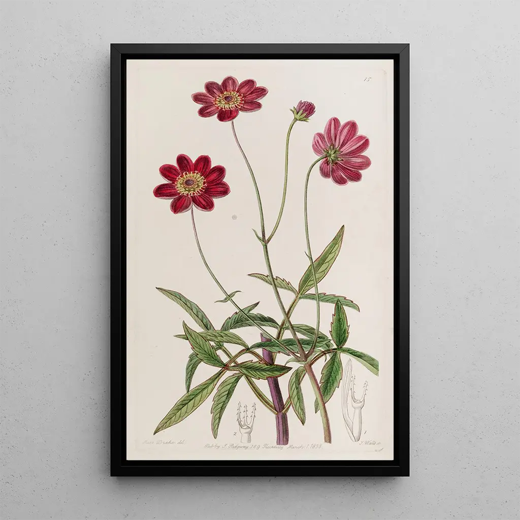 Cosmosin scabiosa-kukilla: lumoava kukkiva tanssi Tässä elävässä teoksessa Sydenham Edwards vangitsee herkkäkauniin cosmosin scabiosa-kukinnan. Pastellivärit kietoutuvat harmonisesti yhteen, luoden kevyen ja ilmavan tunnelman. Vesiväri-tekniikka, jota käytetään hienovaraisesti, mahdollistaa jokaisen terälehden tarkkuuden. Vaaleanpunaisen ja violetin sävyt sekoittuvat hienovaraisesti, herättäen rauhan ja mietiskelyn tunteen. Tämä taidegrafiikan reproduktio kutsuu katsojan sukeltamaan kukkivaan maailmaan, jossa jokainen yksityiskohta tuntuu elävältä, kuin kukat tanssisivat kevyessä tuulessa. Sydenham Edwards: kasvitieteellisen kuvittamisen pioneeri Sydenham Edwards, joka toimi 1800-luvun alussa, tunnetaan merkittävistä panoksistaan kasvitieteellisen kuvittamisen alalla. Romanttisen liikkeen vaikutuksesta hän osasi yhdistää tieteellisen tarkkuuden ja estetiikan teoksissaan. Hänen kuvittajansa, joita usein julkaistiin kasvitieteellisissä teoksissa, ovat olleet keskeisessä asemassa kasvien tuntemuksen levittämisessä. Edwards oli myös Royal Horticultural Society:n jäsen, mikä osoittaa hänen sitoutumisensa kasvitieteeseen ja hortikulttuuriin. Hänen ainutlaatuinen tyylinsä ja kykynsä vangita luonnon kauneus tekevät hänestä merkittävän hahmon aikakaudellaan. Monipuolinen koristeellinen hankinta Taidegrafiikan reproduktio Cosmosin scabiosa-kukasta on täydellinen valinta sisustuksesi kaunistamiseen. Olipa kyseessä olohuone, toimisto tai makuuhuone, tämä kangas tuo raikkautta ja runollisuutta. Tulostuksen laatu takaa uskollisuuden väreihin ja yksityiskohtiin alkuperäisteoksessa, tarjoten esteettistä vetovoimaa. Valitsemalla tämän teoksen, teet hienostuneen sisustuksen valinnan, joka viehättää vieraasi ja luo rauhoittavan tunnelman kotiisi.