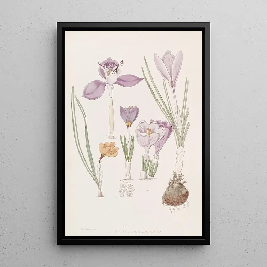Sydenham Edwardsin Crocus-taidegrafiikka vangitsee kevään olemuksen häikäisevällä hienostuneisuudella. Kukkien kirkkaat ja loistavat värit, syvän violetista kirkkaaseen keltaiseen, herättävät uudistumisen ja raikkauden tunteen. Vesiväritekniikka, jota on käytetty mestarillisesti, mahdollistaa terälehtien läpinäkyvyyden ja lehtien pehmeyden kuvaamisen. Tämä teos huokuu rauhoittavaa ja inspiroivaa tunnelmaa, kutsuen katsojan sukeltamaan maailmaan, jossa luonto kukoistaa arvokkaasti.