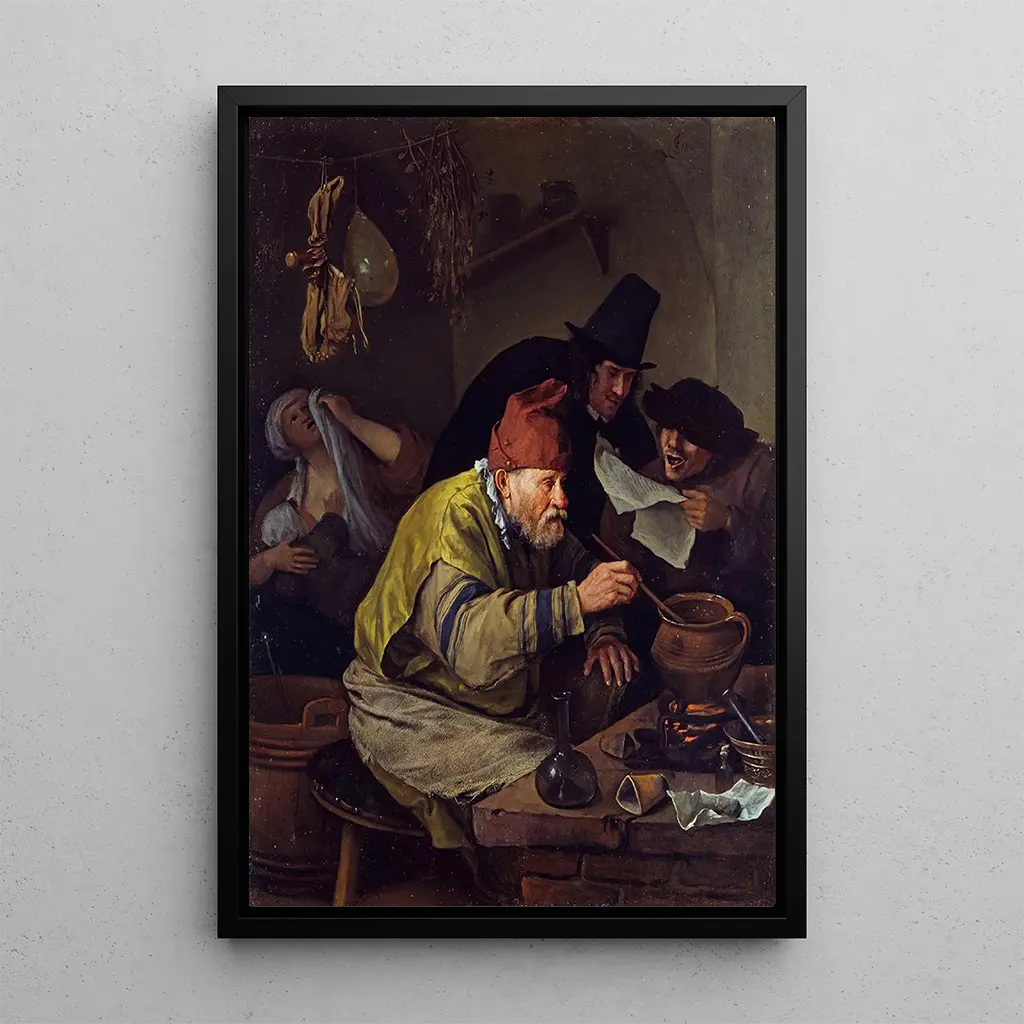 Tässä kiehtovassa teoksessa Jan Steen sukeltaa kiehtovaan alkemistin maailmaan, joka on ympäröity lukuisista salaperäisistä esineistä ja kirkkain värein. Sävellys on rikas yksityiskohdista, jokainen elementti kertoo tarinan, kun taas kultaiset ja maamaiset sävyt luovat sekä lämpimän että arvoituksellisen tunnelman. Taiteilija leikkii taitavasti valolla, korostaen ilmeikkäitä kasvoja, jotka vaikuttavat olevan kiehtoutuneita alkemistin kokeiluista. Tämä taulu, todellinen elämän kuva, kutsuu meitä tutkimaan tiedon, uteliaisuuden ja tieteen mysteerien teemoja.