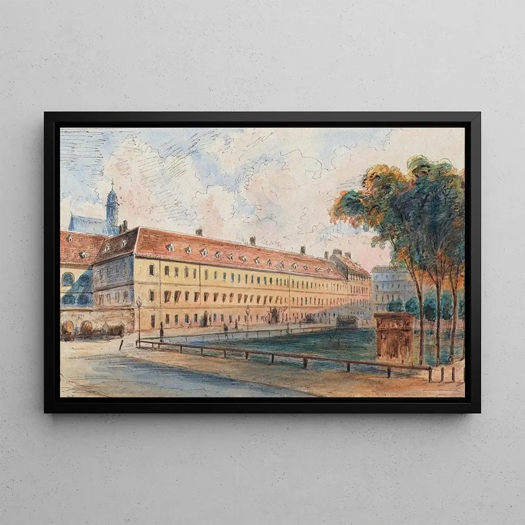 "La caserne de Salzgries" est une œuvre qui évoque la force et la majesté des bâtiments militaires du XIXe siècle. Ce tableau dépeint une caserne imposante, avec des lignes architecturales précises et une palette de couleurs terreuses qui souligne la robustesse de la structure. La lumière joue un rôle essentiel, mettant en valeur les détails des façades et créant une atmosphère de respect et de nostalgie. L'artiste parvient à capturer non seulement l'édifice, mais aussi l'esprit d'une époque où l'architecture militaire était à la fois fonctionnelle et symbolique, témoignant de la puissance d'un État.