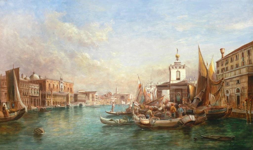 La Dogana, œuvre emblématique d'Alfred Pollentine, transporte le spectateur au cœur de Venise, où l'animation des quais et la beauté des bâtiments se mêlent harmonieusement. Les couleurs chatoyantes, allant des bleus profonds aux ocres chaleureux, créent une atmosphère vivante et accueillante. La technique de l'artiste, qui utilise des coups de pinceau délicats et des détails minutieux, donne vie à cette scène maritime. Les voiles des bateaux se dressent fièrement, tandis que les passants s'affairent, tous plongés dans le quotidien d'une ville où le commerce et l'art se rencontrent.