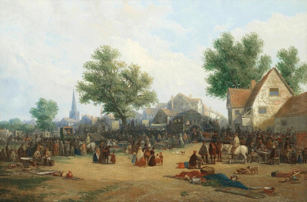 La foire du village de James Holland est une œuvre qui capte l'essence même de la vie rurale anglaise au XIXe siècle. Les couleurs éclatantes et les détails minutieux plongent le spectateur dans une scène animée, où les personnages se mêlent dans une danse joyeuse. Les jeux de lumière et d'ombre créent une atmosphère chaleureuse, tandis que les éléments naturels, tels que les arbres et les champs, encadrent cette célébration de la communauté. La technique de la peinture à l'huile permet à Holland de jouer avec les textures, rendant chaque élément de la toile vivant et palpable.