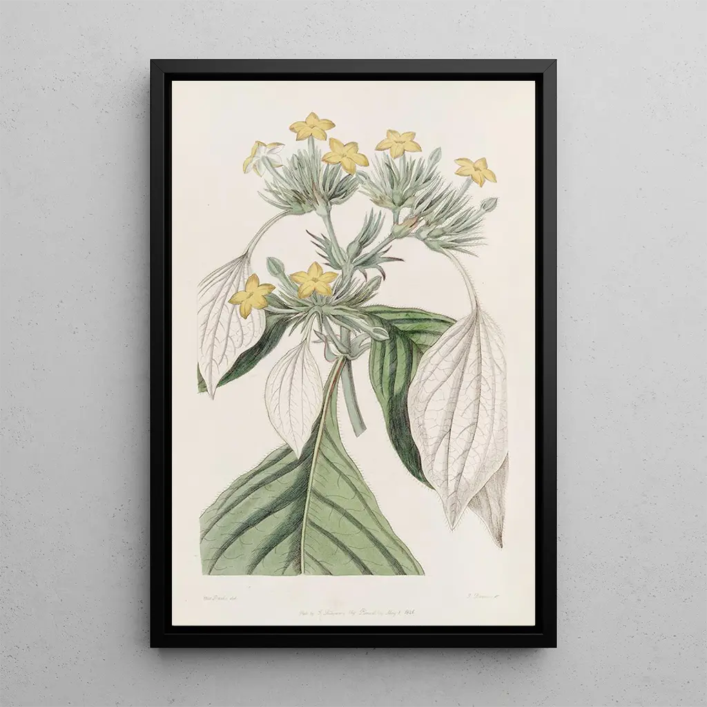 La mussaenda suureilla lehdillä, Sydenham Edwardsin teos, viittaa trooppiseen rehevyyteen suurten vihreiden lehtien ja loistavien kukkien kautta. Jokainen yksityiskohta on huolellisesti toteutettu, lehtien suonista hienovaraisiin sävyihin, luoden harmonisen kokonaisuuden, joka houkuttelee katsojan huomion. Vesiväritekniikka, sen hienovaraisine värivivahteineen, välittää tämän kasvin raikkauden ja elinvoiman, samalla luoden rauhoittavan tunnelman. Tämä taidegrafiikka kutsuu pakomatkalle, kuljettaen katsojan eksoottisiin maisemiin, joissa luonto hallitsee.