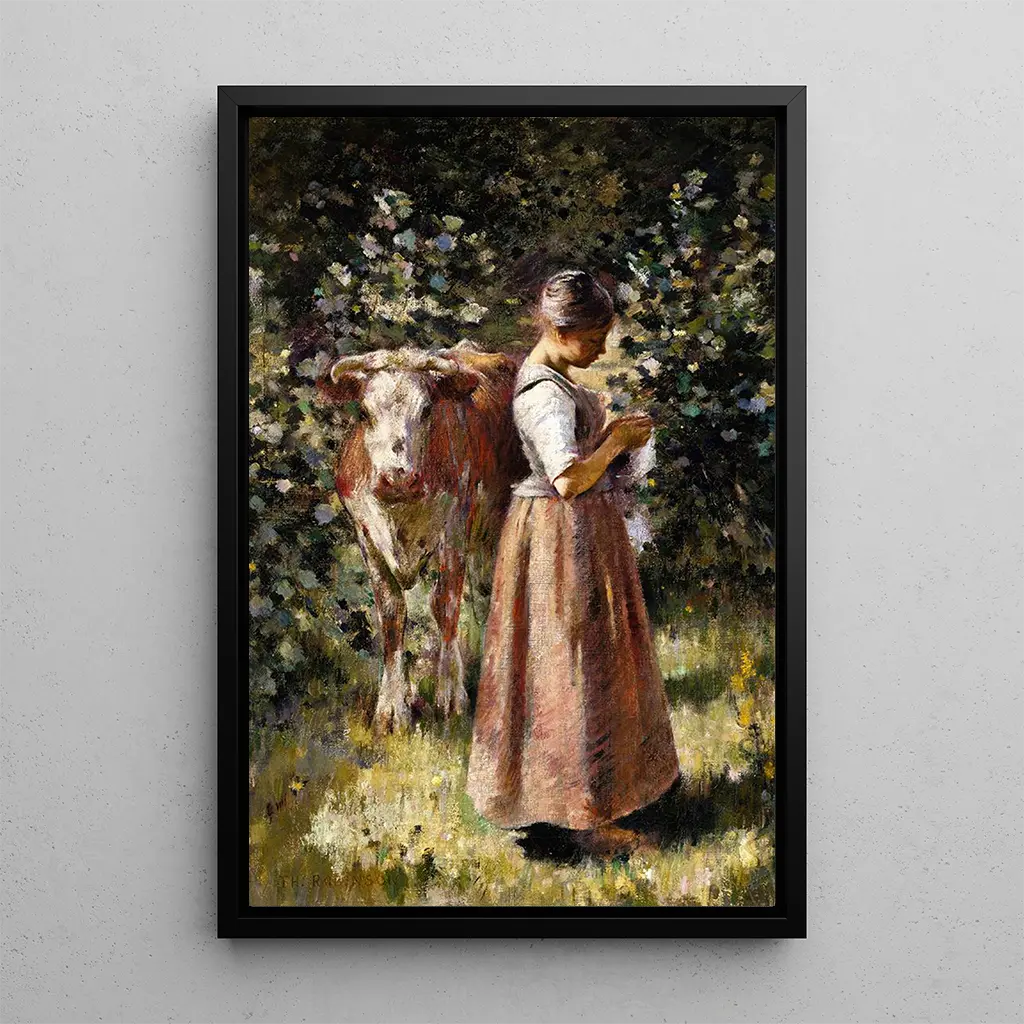 "La vachère" -teoksessa Theodore Robinson vangitsee idyllisen ja rauhallisen maalaismaiseman olemuksen. Kompositio korostaa nuorta naista, joka pukeutuneena yksinkertaiseen mekkoon hoitaa lehmää vehreässä maisemassa. Pehmeät ja luonnolliset värit, kirkkaista vihreistä lämpimiin ruskeisiin, luovat rauhoittavan tunnelman. Robinsonin impressionistinen tekniikka, joka on luonteeltaan sulavia siveltimen vetoja ja hienovaraista valoa, herättää tämän arkipäiväisen kohtauksen eloon ja kutsuu katsojan tuntemaan maaseudun rauhan. Tämä taidegrafiikka ei ainoastaan kuvaa luonnon kauneutta, vaan myös yksinkertaisuutta ja harmonista maaseudun elämää.