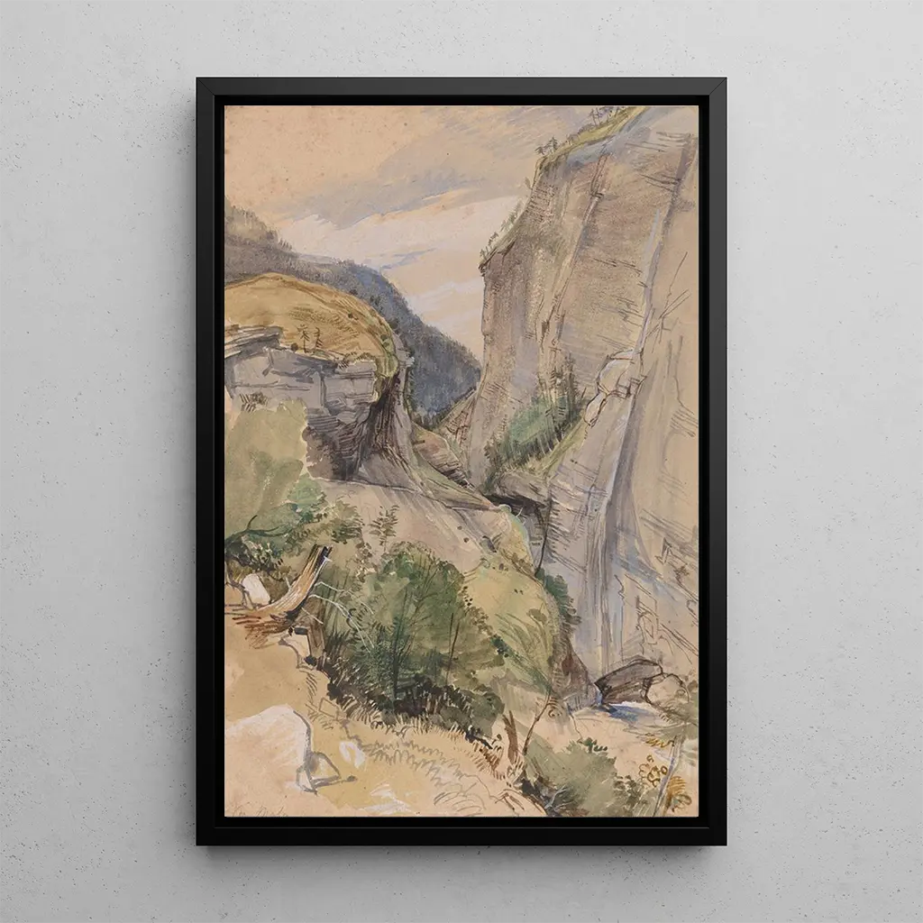 „La Via Mala“, John Frederick Lewisin merkittävä taidegrafiikka, kuljettaa meidät majesteettiseen vuoristomaisemaan, jossa luonnon villi voima paljastuu voimalla ja hienovaraisuudella. vaikuttavat jylhät vuoret, valoon kylpevänä, kontrastoivat syvien laaksojen varjojen kanssa, luoden sekä dramaattisen että rauhallisen tunnelman. Väriteemassa, joka ulottuu kirkkaista vihreistä syviin harmaisiin, heijastuu sveitsiläisten maisemien raaka kauneus. Lewis, hänen tekninen hallintansa avulla, onnistuu vangitsemaan luonnon suuruuden samalla tuoden kohtauksen inhimillisen ulottuvuuden, kutsuen katsojan tutkimaan tätä paratiisin nurkkaa.