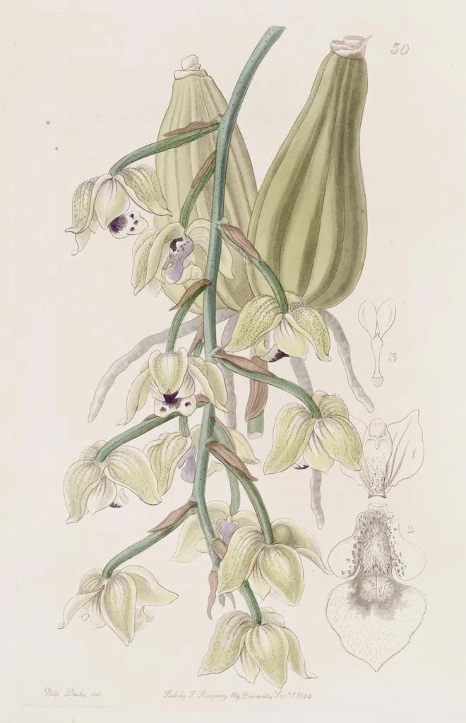 Lacaena bicolore, Sydenham Edwardsin teos, on taidegrafiikka, joka juhlistaa luonnon kauneutta kirkkaiden värien paletilla. Vihreän ja keltaisen sävyt sekoittuvat harmonisesti, luoden elävän ja iloisen ilmapiirin. Vesiväritekniikka, jonka taiteilija hallitsee, mahdollistaa yksityiskohtien hienostuneisuuden vangitsemisen, olipa kyse sitten terälehdistä tai lehdistä, samalla tarjoten sulavuutta, joka viittaa liikkeeseen. Tämä taidegrafiikka kutsuu rauhalliseen pohdiskeluun, jossa jokainen katse paljastaa uuden puolen tästä kiehtovasta kasvista, ikään kuin se heräisi eloon silmiemme edessä.