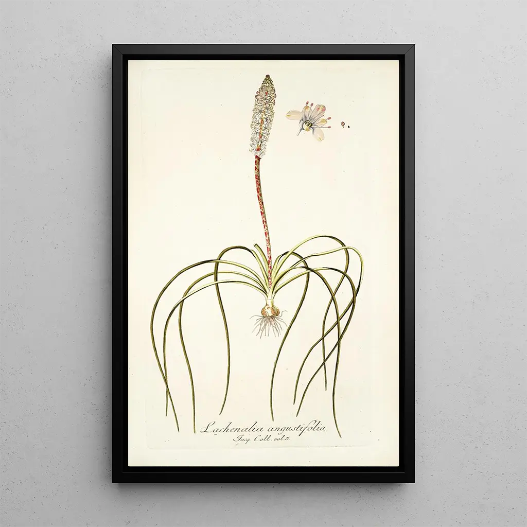 Lachenalia angustifolia, Nikolaus Joseph Freiherr von Jacquinin kiehtova teos, kuljettaa meidät rikkaaseen ja värikkääseen kukkamaailmaan. Tämä taidegrafiikka korostaa kukkien hienovaraisia sävyjä, joissa kirkkaat värit sulautuvat harmonisesti hienovaraisiin varjoihin. Jacquinin hallitsema vesiväritekniikka mahdollistaa elävän ja dynaamisen esityksen tästä kasvista, joka kuvaa luonnon kauneutta ja haurautta. Tämän taulun tunnelma on sekä rauhoittava että inspiroiva, kutsuen ihmettelemään kasvikunnan monimuotoisuutta.