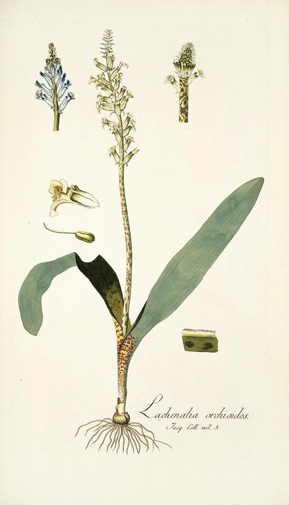 Nikolaus Joseph Freiherr von Jacquin, 1700-luvun merkittävä hahmo, osasi yhdistää intohimonsa taiteeseen ja kasvitieteeseen. Tunnettu kasvitieteilijä, hän matkusti ympäri maailmaa tutkiakseen ja kuvitellakseen harvinaisia kasvilajeja. Aikansa tieteellisten virtauksien vaikutuksesta hän osallistui eksoottisten kasvien dokumentointiin, samalla kehittäen ainutlaatuisen taiteellisen tyylin. Lachenalia orchioides kuvastaa täydellisesti tätä yhdistelmää tieteellisen tarkkuuden ja taiteellisen herkkyyden välillä, tehden Jacquinista edelläkävijän kasvitieteellisessä kuvittamisessa. Hänen teoksensa inspiroi yhä taiteen ja luonnon ystäviä.