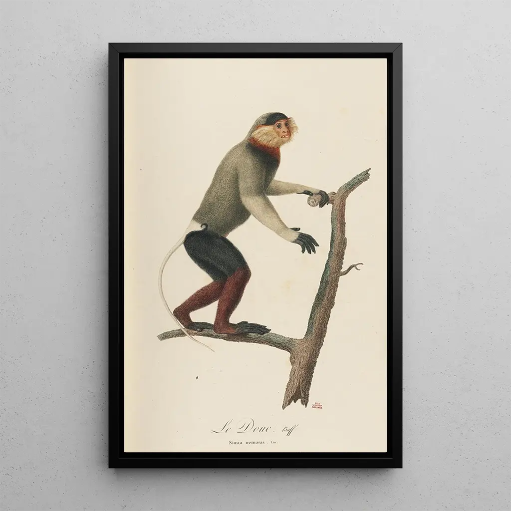 Tässä taidegrafiikka-versiossa Doucista Jean-Baptiste Audebert johdattaa meidät eläväisen viidakon sydämeen, jossa kirkkaiden värien loisto ja yksityiskohtien tarkkuus vangitsevat tämän kiehtovan eläimen olemuksen. Douc, jonka turkki hehkuu sinisen, keltaisen ja punaisen sävyissä, seisoo majesteettisesti, tarjoten visuaalisen näytelmän, joka heijastaa biodiversiteetin rikkautta. Taiteilijan tekniikka, yhdistäen vesiväriä ja piirustusta, luo sekä herkkää että dynaamista tunnelmaa, kutsuen katsojan ihailemaan tämän primaten sulokkuutta ja eleganssia.