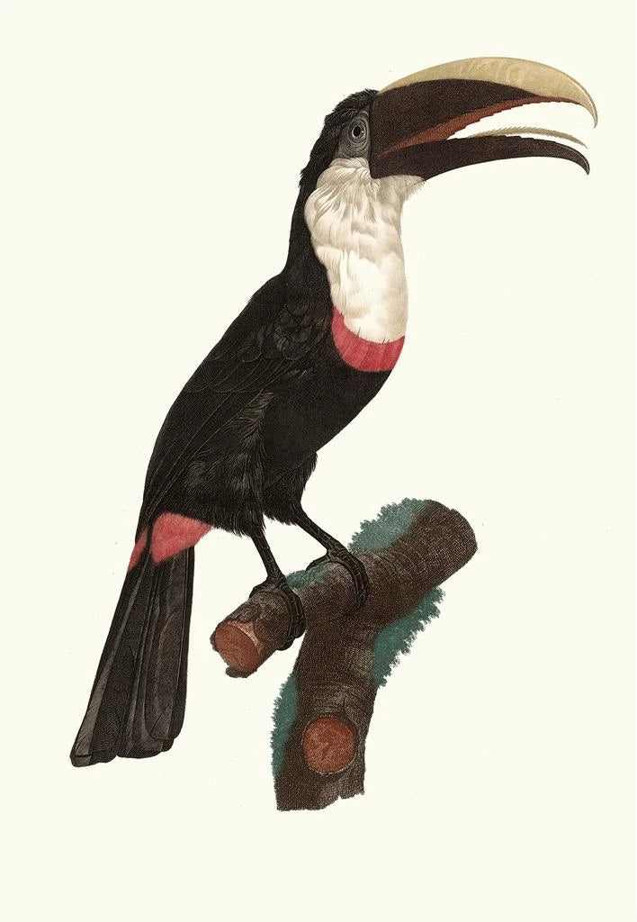 Tässä elävässä teoksessa Jacques Barraband johdattaa meidät vilkkaaseen kohtaukseen, jossa Tocard, kirkkaasti höyhenin koristeltu lintu, herää eloon. Sen höyhenten hohtavat värit, syvän sinisestä kirkkaan keltaiseen, luovat vaikuttavan kontrastin herkän kankaan taustaan. Barrabandin tekniikka, yhdistäen akvarellin ja guassan, antaa kokonaisuudelle keveyttä, lähes ilmavaa. Tämän taidegrafiikan välittämä ilmapiiri on sekä iloinen että rauhoittava, kutsuen katsojan ihmettelemään luonnon kauneutta.