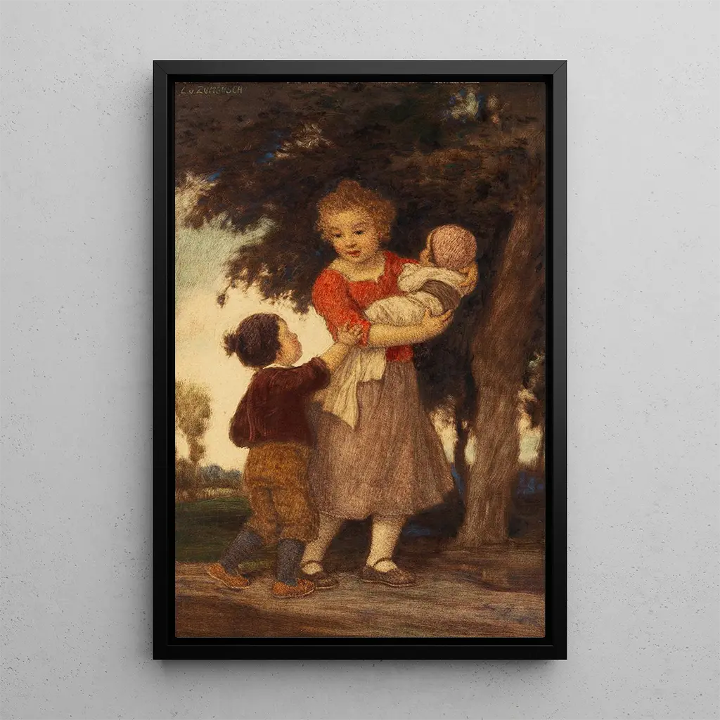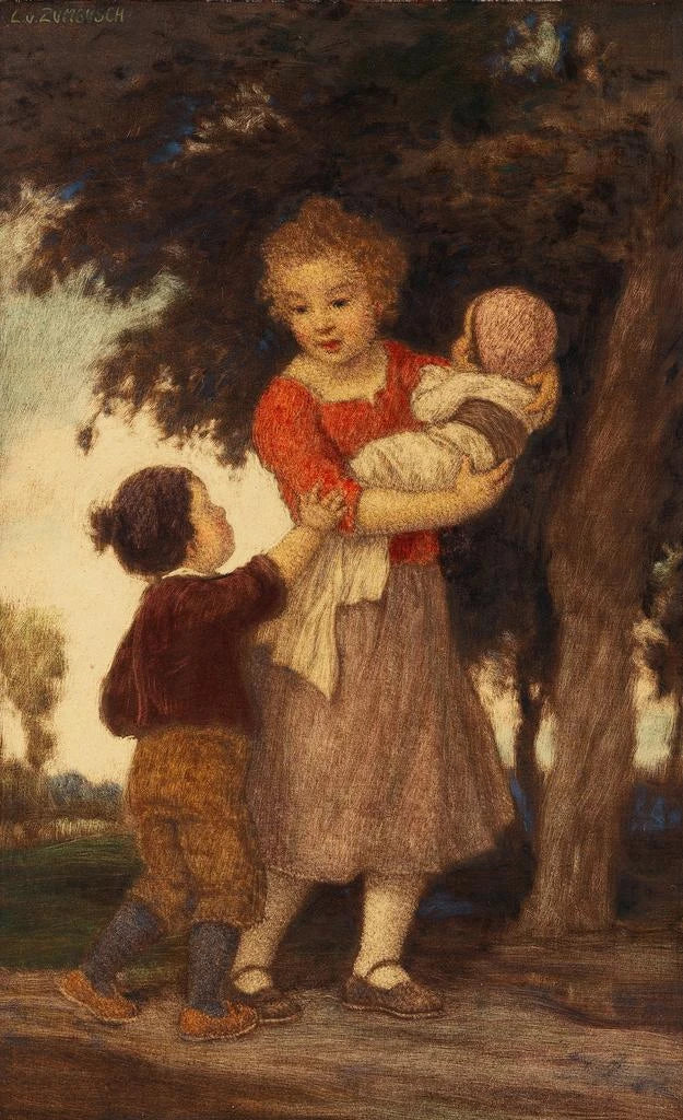 In "Les trois frères et sœurs" schildert Ludwig von Zumbusch een ontroerende scène die de verbondenheid en broederlijke liefde oproept. De compositie benadrukt de drie kinderen, vastgelegd in een moment van spel en vreugde, omgeven door weelderige natuur die een levendige dimensie aan het kunstwerk toevoegt. De levendige kleuren en minutieuze details, typerend voor de stijl van Zumbusch, creëren een warme en uitnodigende sfeer. Elk gezicht drukt een oprechte emotie uit, waardoor dit doek niet alleen een familietekening is, maar ook een viering van de kindertijd en de banden die mensen verbinden.