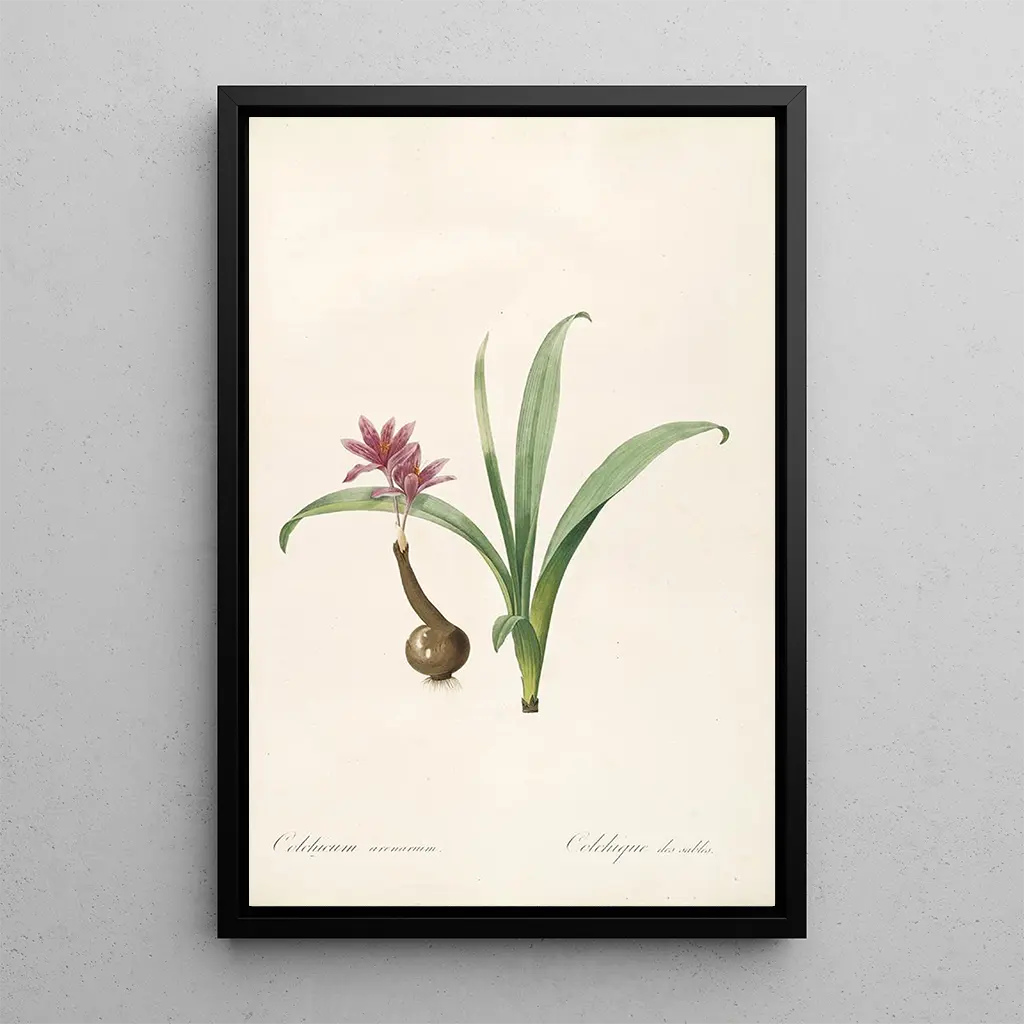 Taidegrafiikka Les Liliacées Pl46 sukeltaa herkkään universumiin, jossa jokainen terälehti vaikuttaa kertovan tarinan. Pierre Joseph Redouté, taiteellinen kasvitieteilijä, käyttää pehmeitä ja luonnollisia värejä, luoden rauhoittavan ja mietiskelevän ilmapiirin. Hänen piirteidensä tarkkuus ja yksityiskohtien hienostuneisuus paljastavat poikkeuksellisen vesiväritekniikan, jossa valo näyttelee avainroolia herättääkseen nämä kukat eloon. Tämä taidegrafiikka kutsuu ihmettelemään, ikään kuin voisi melkein tuntea niiden lumoavan tuoksun.