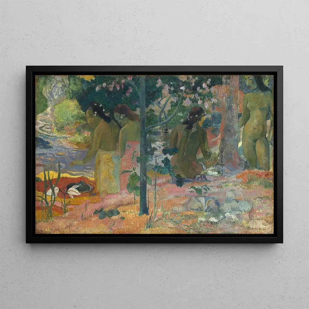 Tässä eloisassa teoksessa Paul Gauguin johdattaa meidät maailmaan, jossa luonto ja ihmisyys kohtaavat täydellisessä harmoniassa. Uimarit, valon säteissä kylpevät, rentoutuvat veden äärellä, ympäröitynä rehevillä maisemilla. Lämmittävät ja kylläiset värit, jotka ovat tyypillisiä post-impressionistisen tyylin, luovat tunnelman rauhasta ja ilosta. Gauguinin laaja ja ilmeikäs sivellinjälki herättää jokaisen hahmon eloon, luoden sekä dynaamisen että rauhallisen kohtauksen. Tämä taulu kutsuu mietiskelyyn ja pakoon, todellinen elämän kuva, jossa aika tuntuu pysähtyneen.