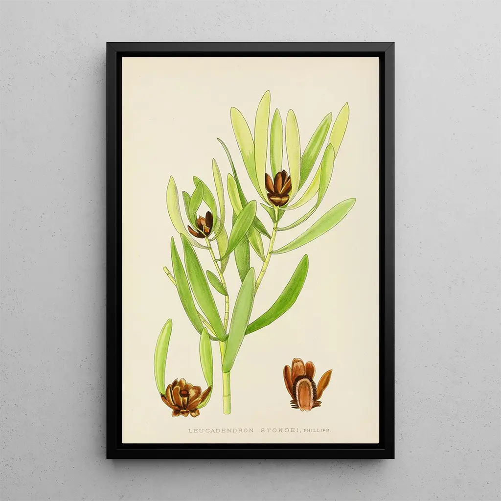 Leucadendron stokoei, sen keihäsmäisten lehtien ja eloisien sävyjen kanssa, herättää maailman, jossa luonto ilmaisee itseään rohkeasti. Tämä Etelä-Afrikasta kotoisin oleva kasvi erottuu kultaisilla kukinnoillaan, jotka valaisevat maisemaa. Taiteilija Illtyd Buller Pole-Evansin tekniikka vangitsee valon ainutlaatuisella tavalla, luoden sekä rauhallisen että dynaamisen ilmapiirin. Jokainen sivellinvedos tuntuu kertovan tarinan, kutsuen katsojan sukeltamaan tämän harvinaisen lajin kiehtovaan maailmaan.